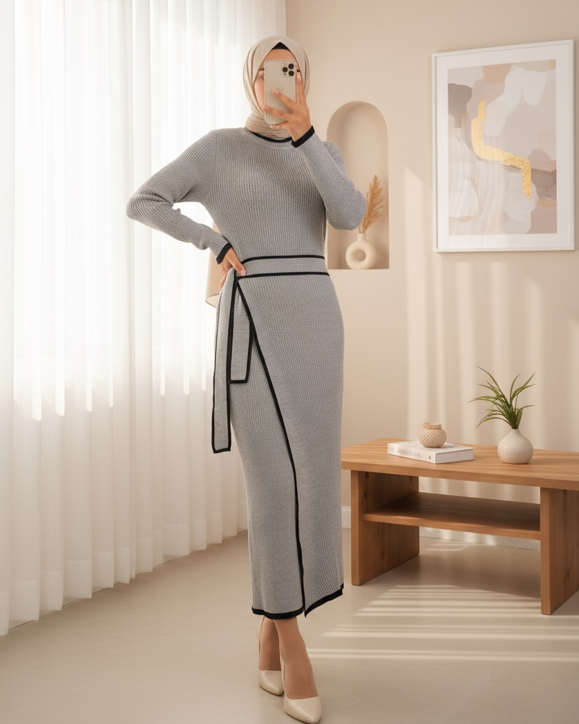 Yandan Bağlamalı Etekli Alerli Triko Elbise -Gri-Gri