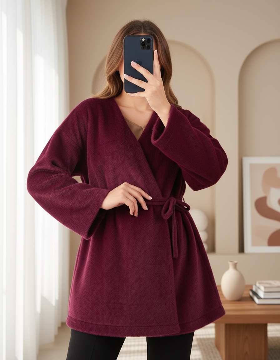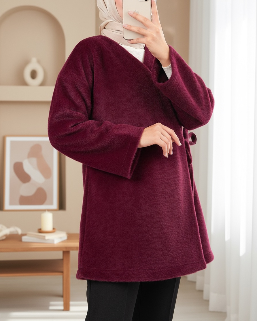 Yandan Bağlamalı Kürklü Ceket -Bordo-Bordo