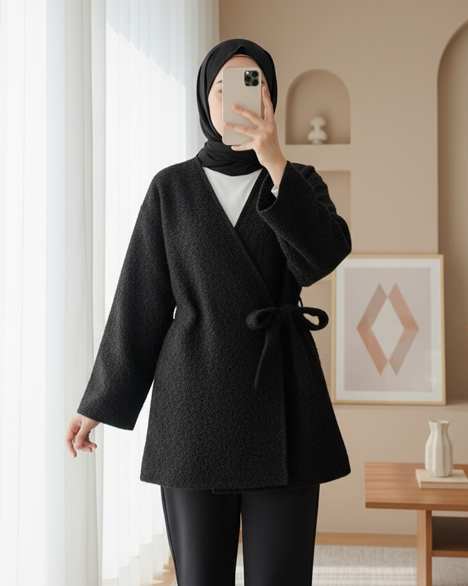 Yandan Bağlamalı Sakallı Kimono -Siyah-siyah