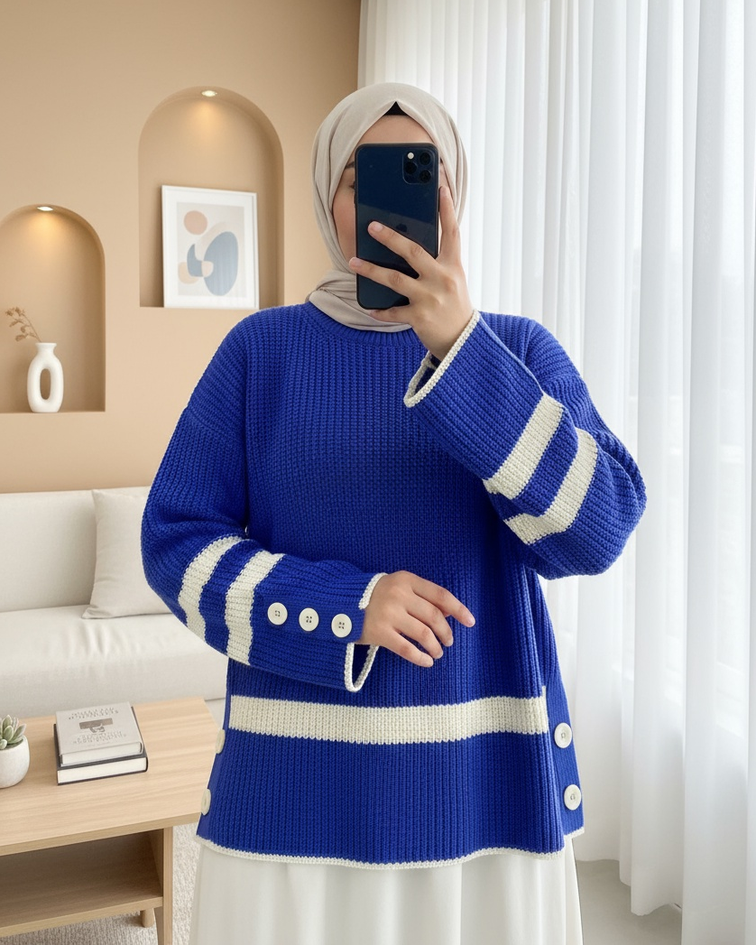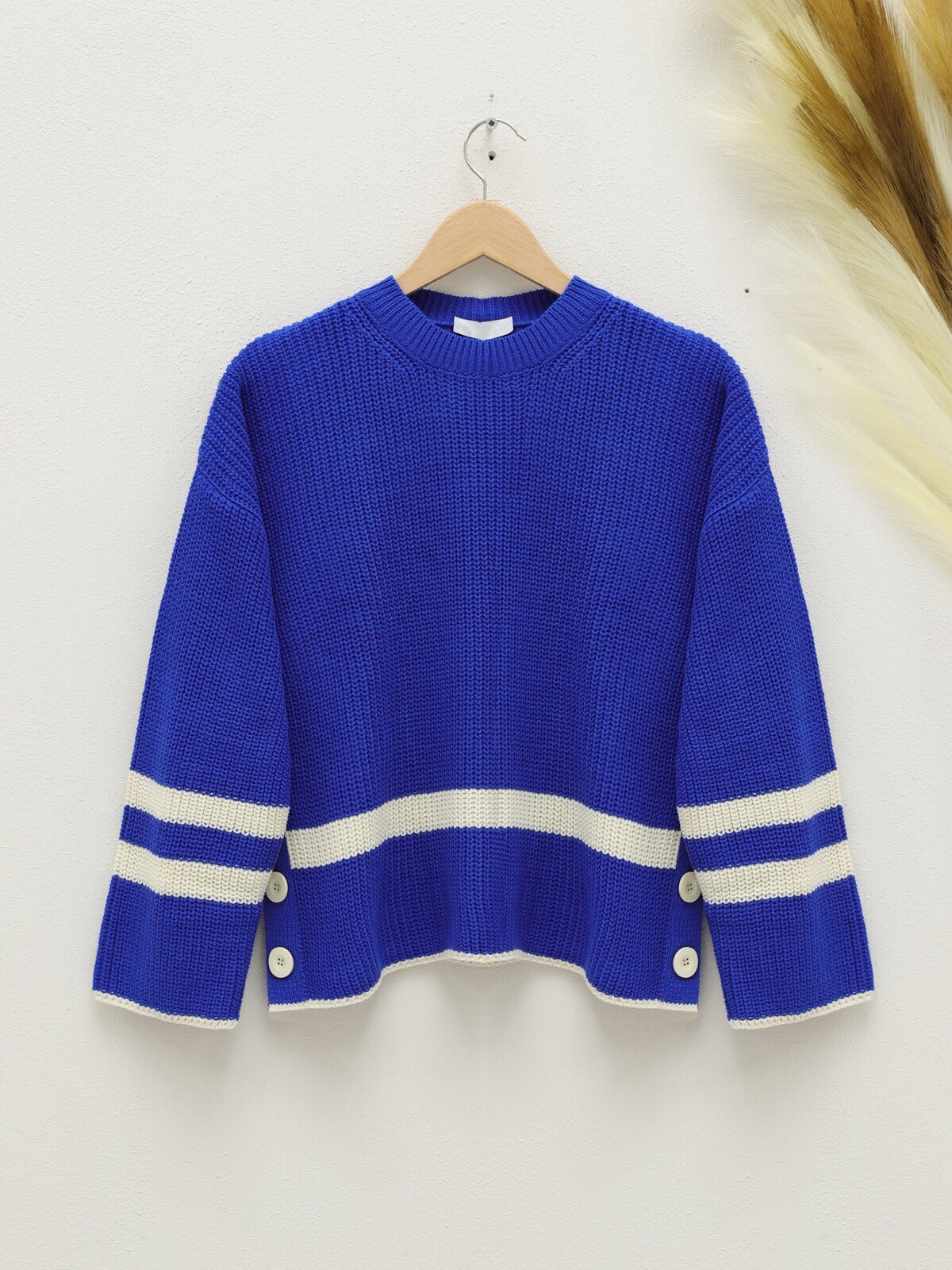 Yanları Düğmeli Örgü Desen Triko Kazak -Saks-Saks