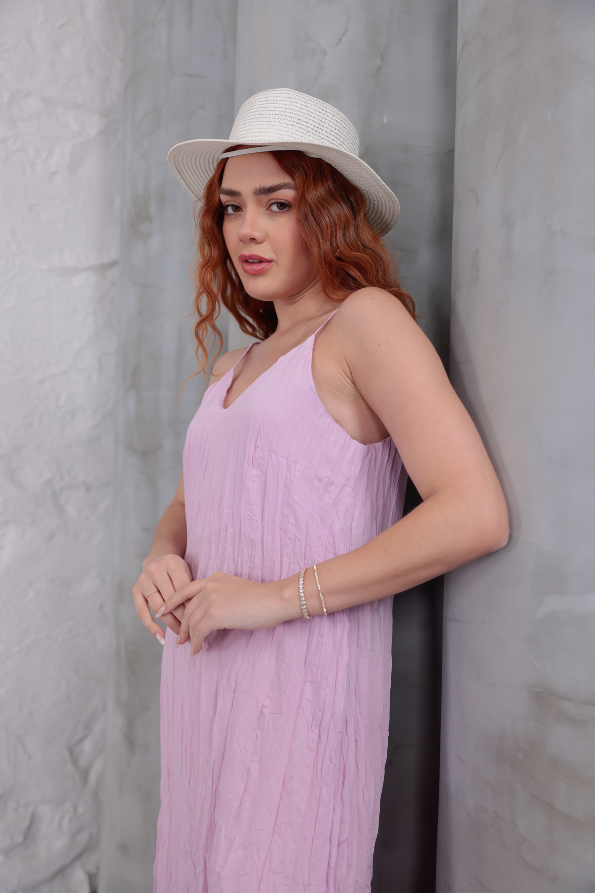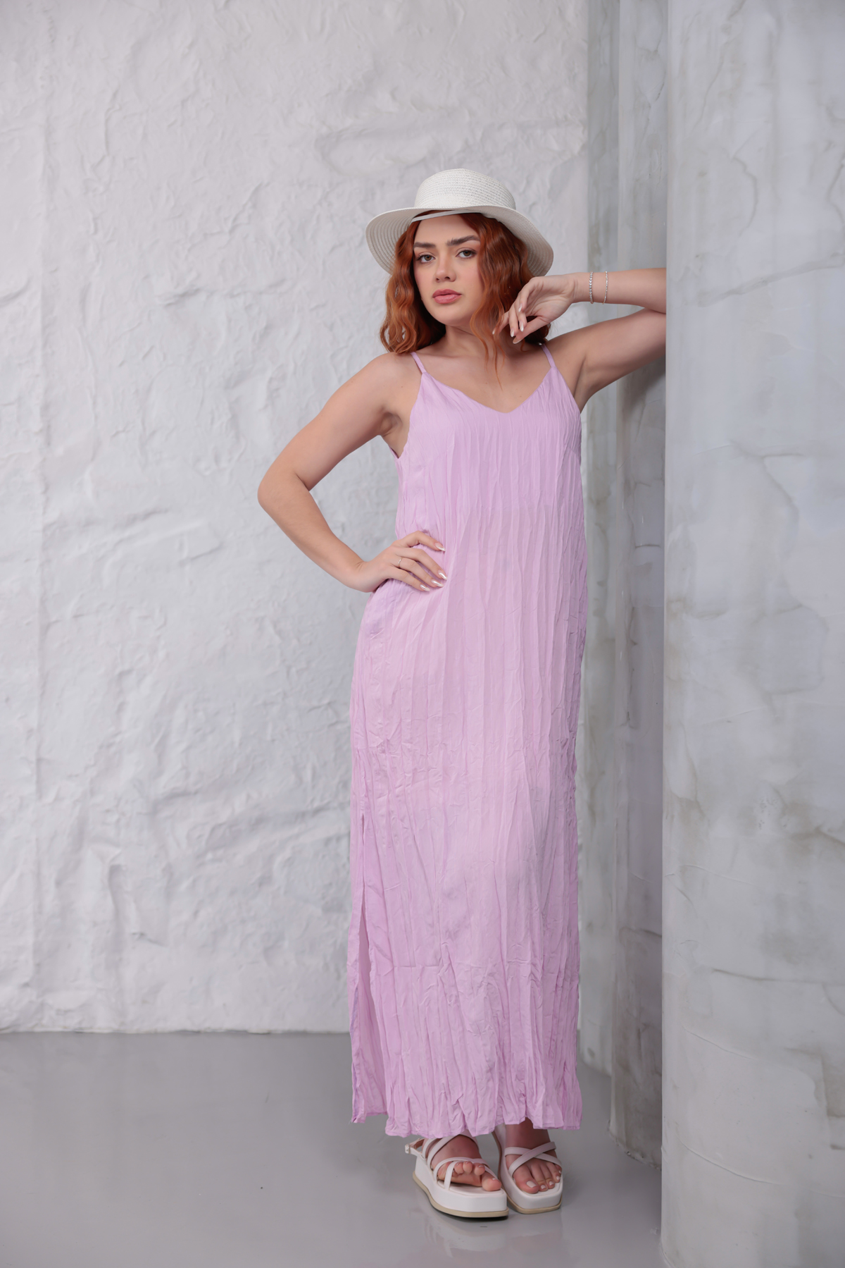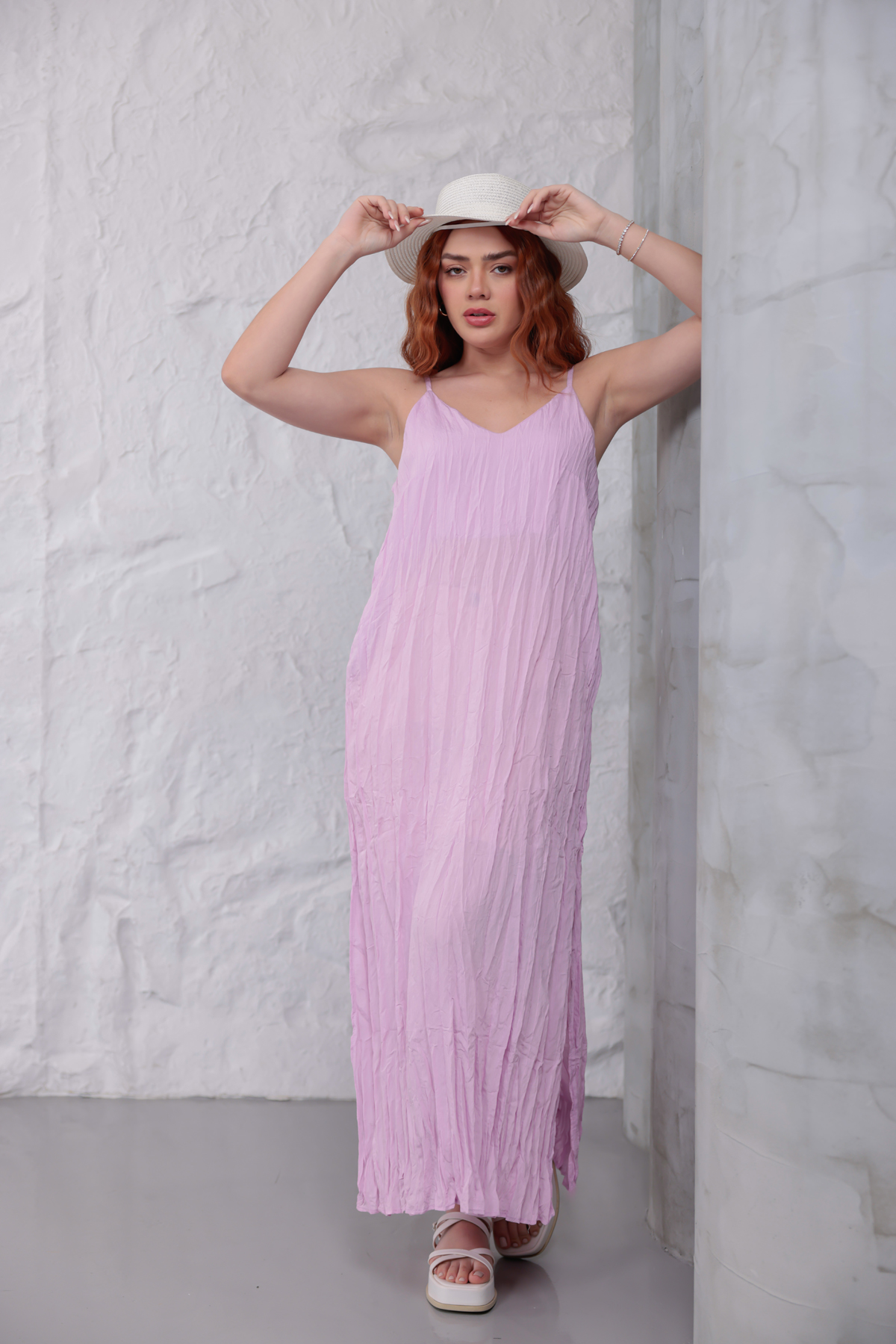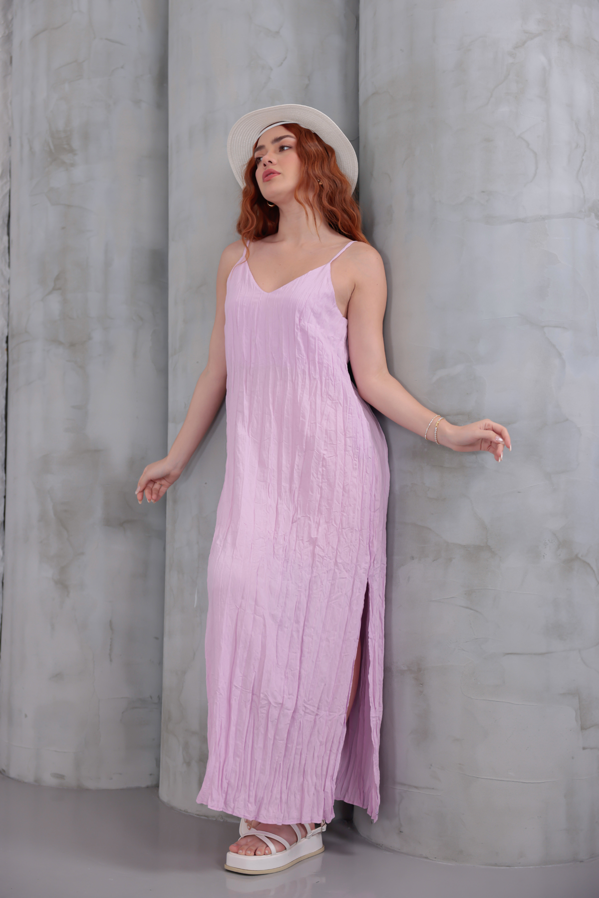 Yanları Yırtmaçlı Askılı Elbise Lila-Lila