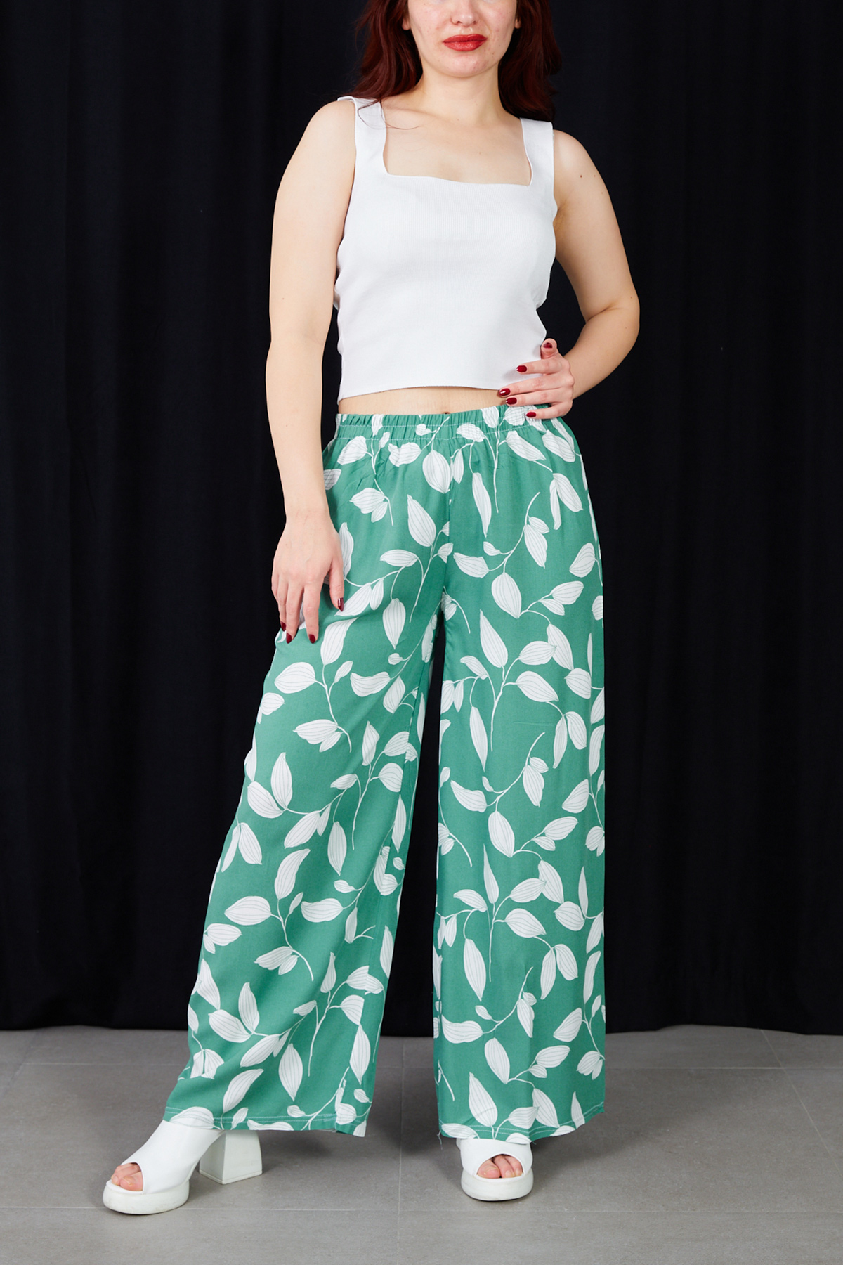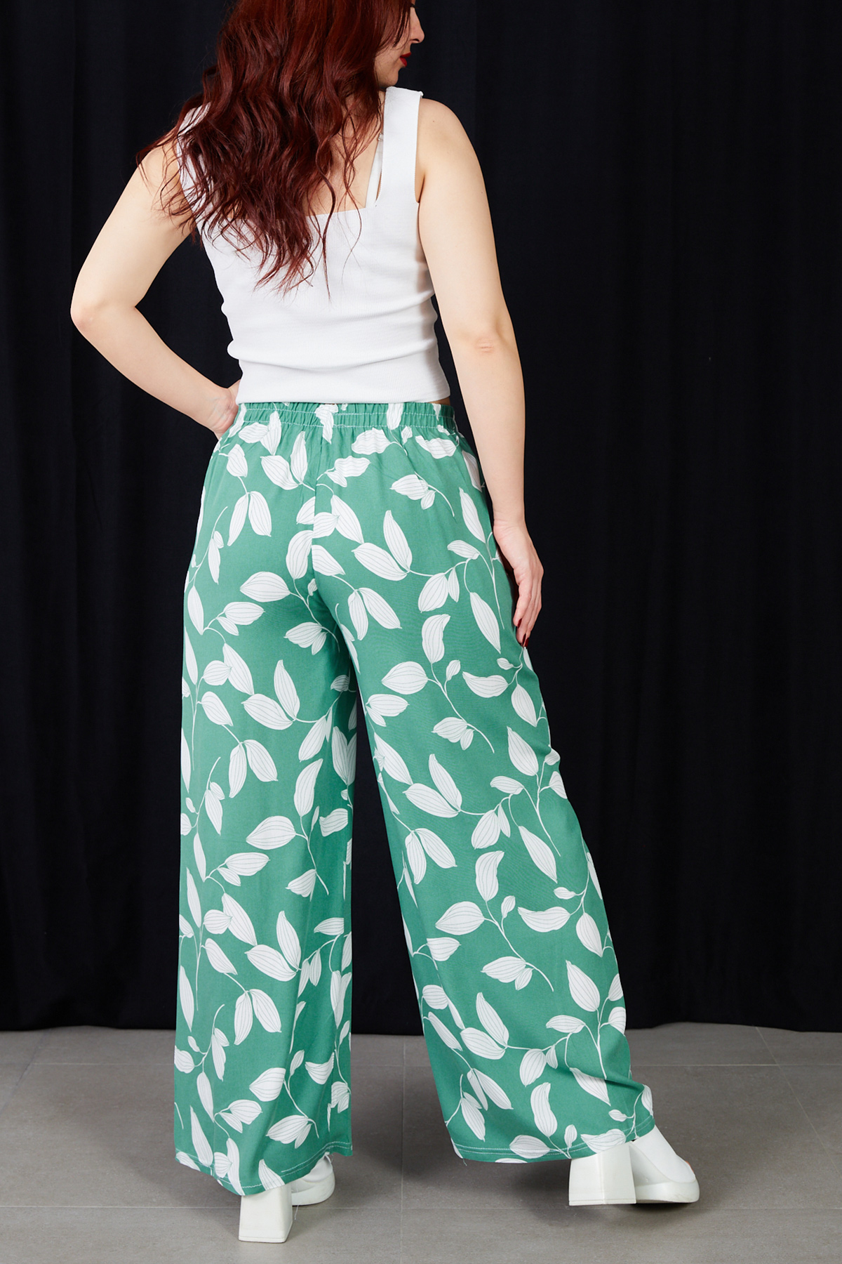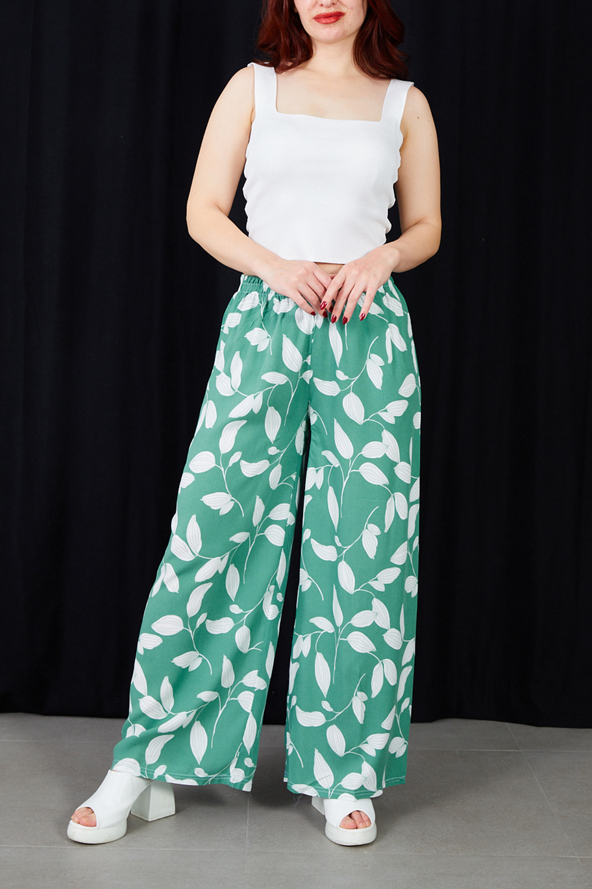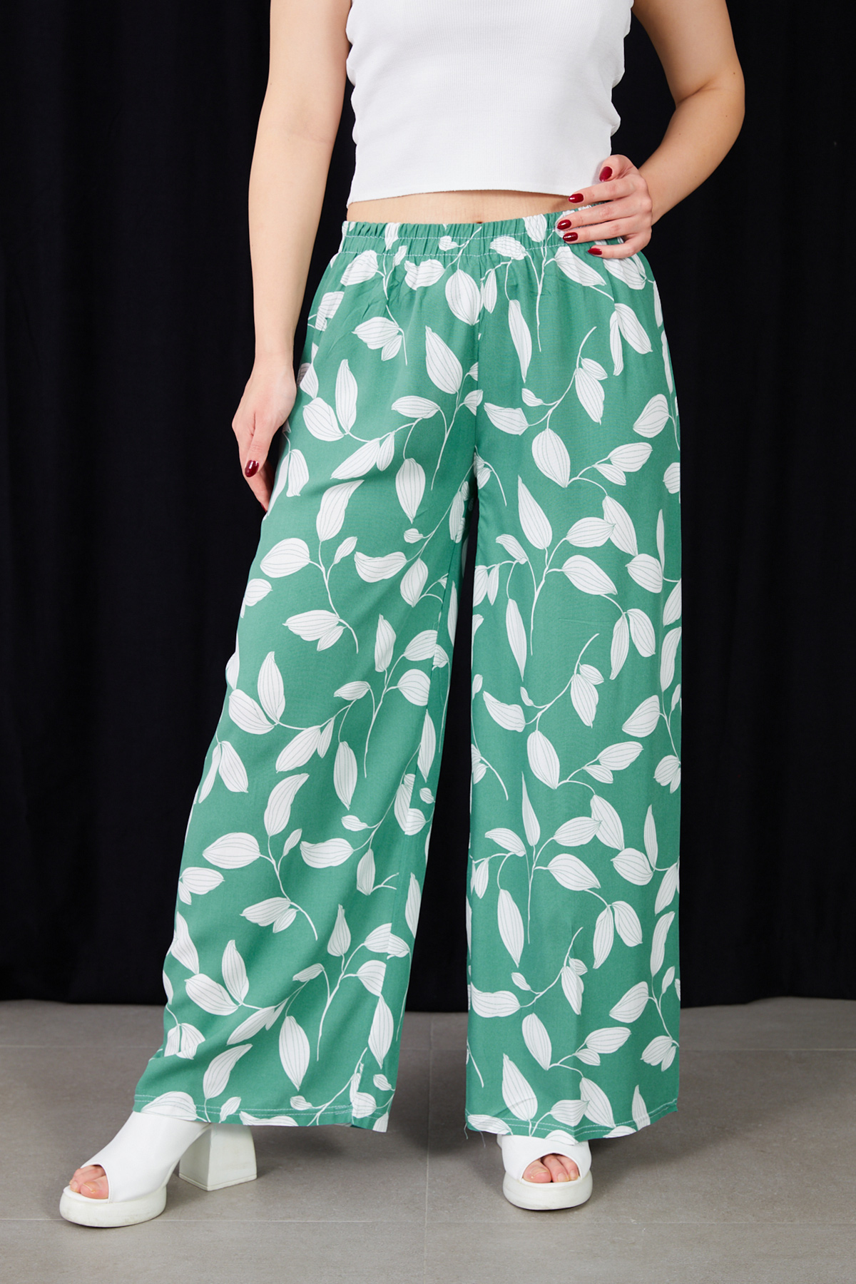 Yaprak Desenli Rahat Kalıp Beli Lastikli Bol Paça Pantolon-Su Yeşili
