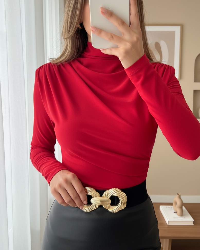 Yarım Boğaz Büzgülü Sandy Bluz -Kırmızı-Kırmızı