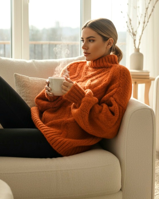 Yarım Boğazlı Balon Kol Kışlık Kazak -Turuncu-Turuncu