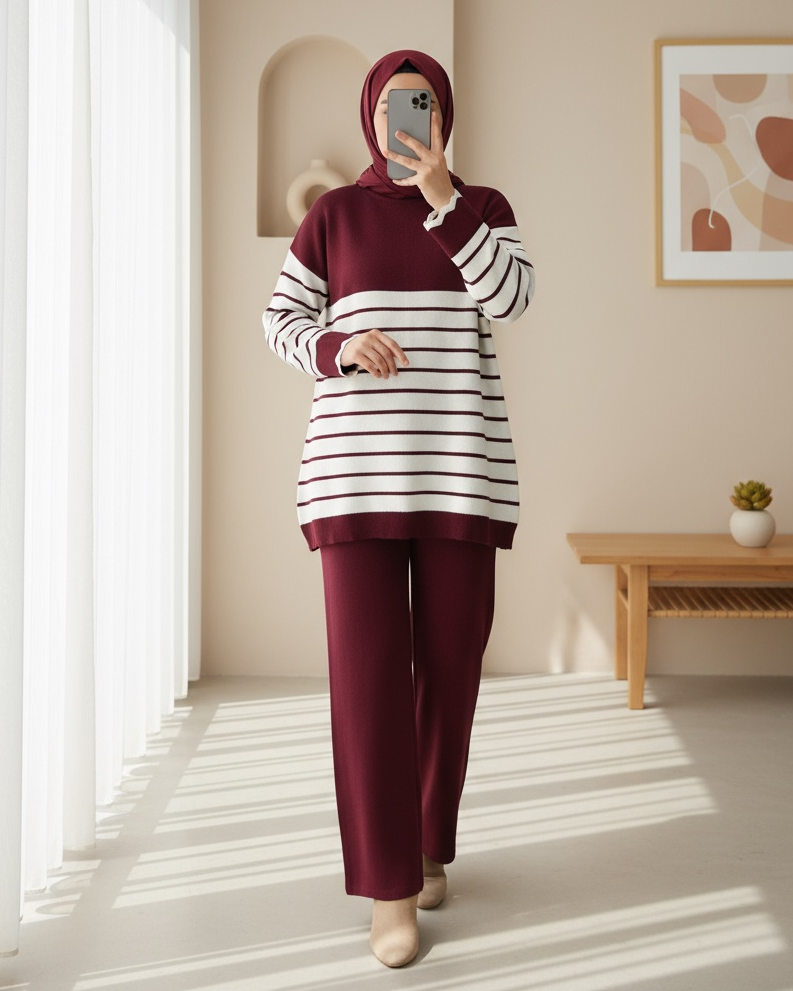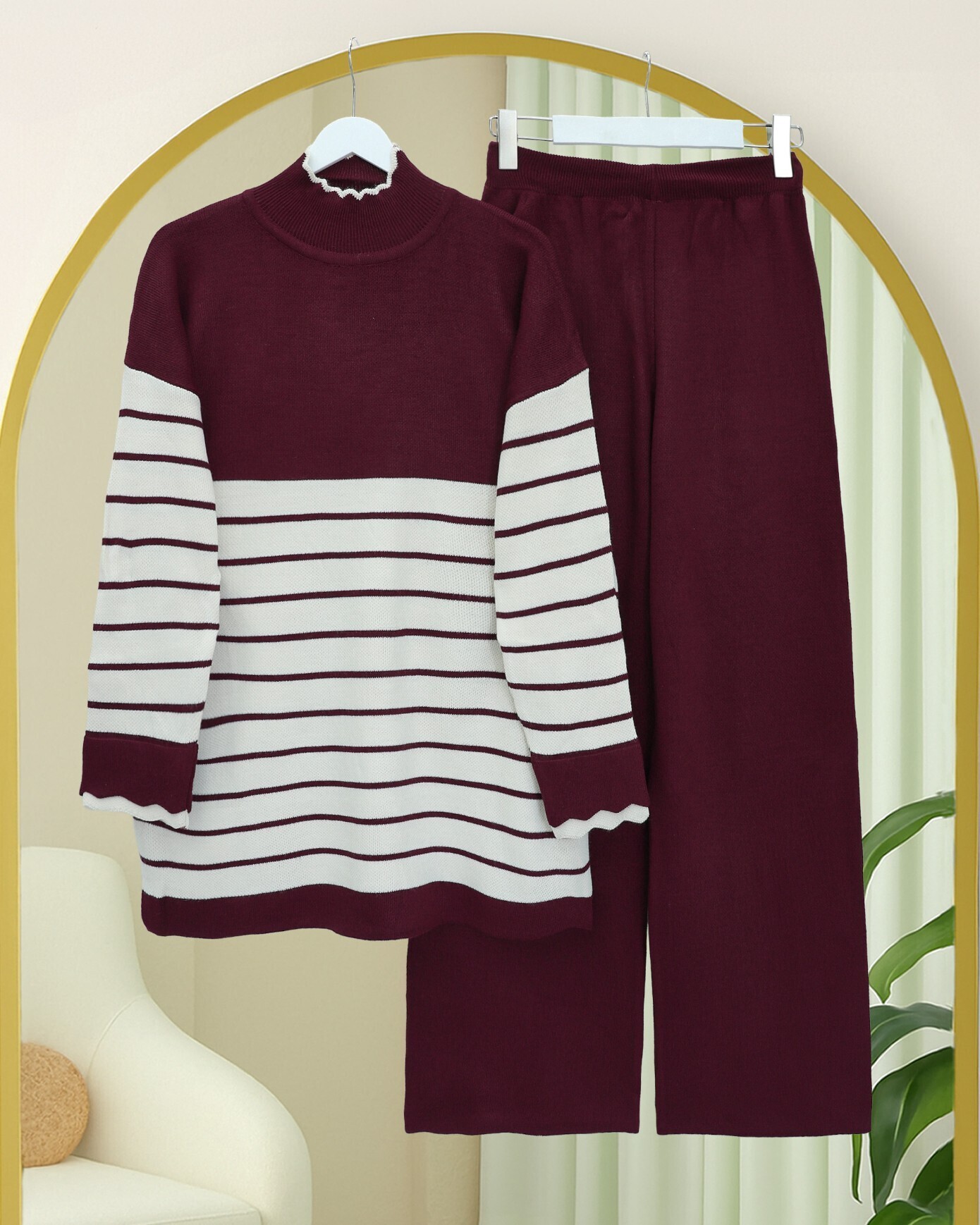 Yarım Boğazlı Çizgili Triko Takım -Bordo-Bordo