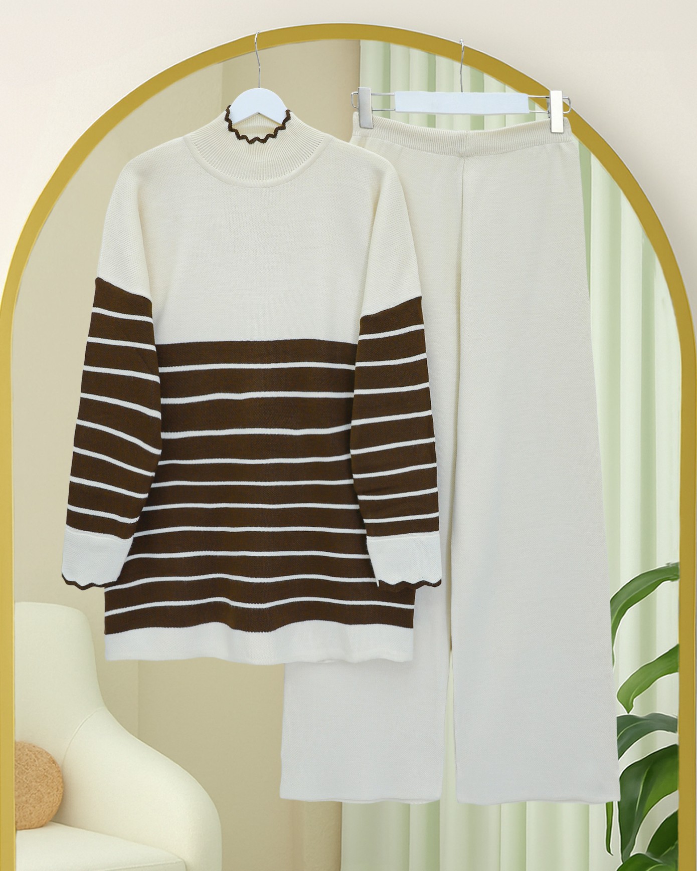 Yarım Boğazlı Çizgili Triko Takım -Kahve-Kahve