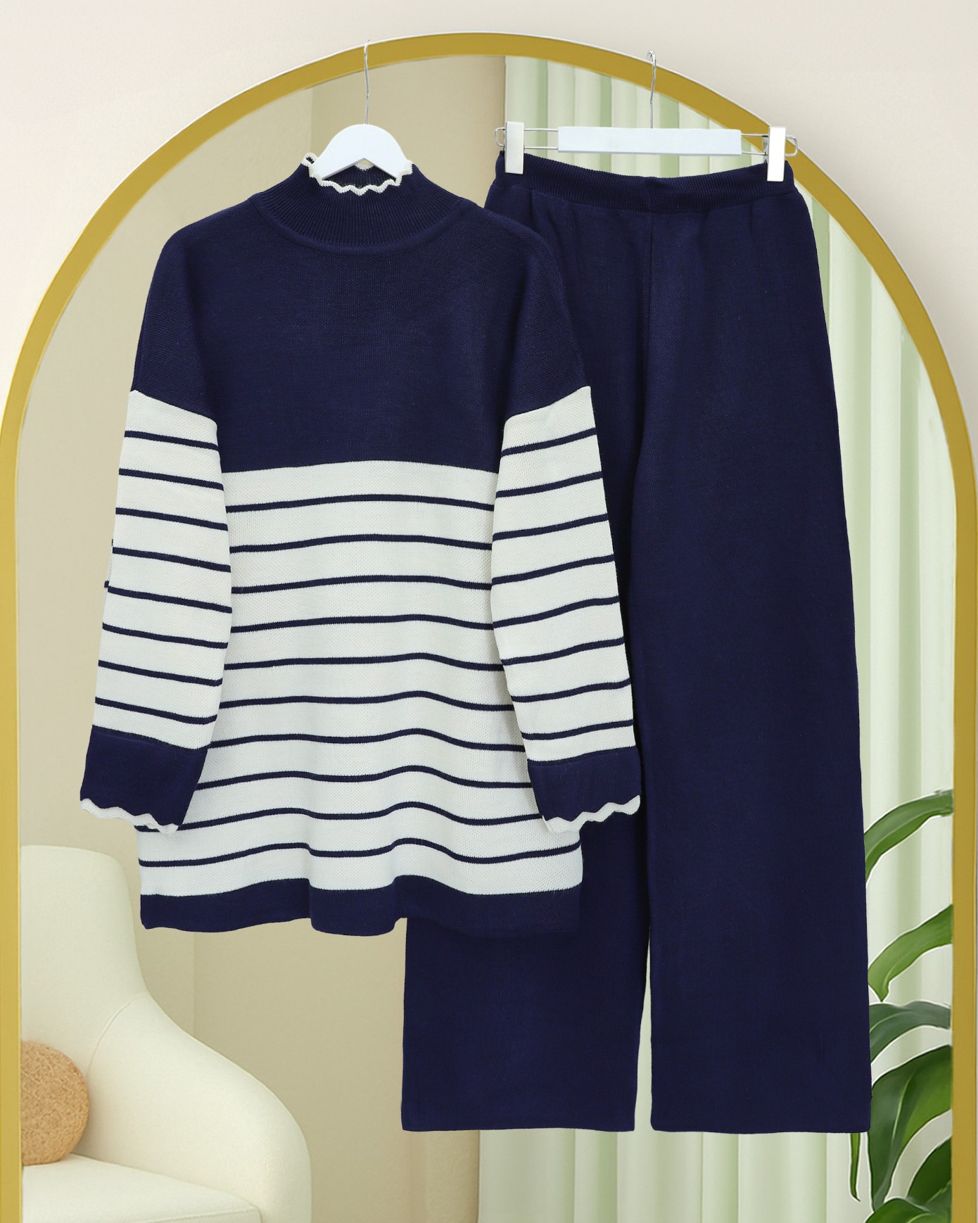 Yarım Boğazlı Çizgili Triko Takım -Laci-Lacivert