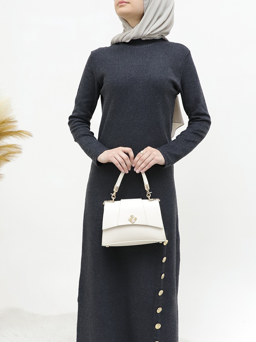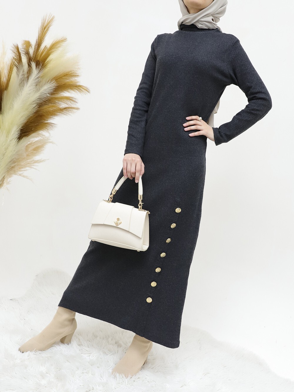 Yarım Boğazlı Eteği Düğme Detaylı Elbise -Antrasit-Antrasit