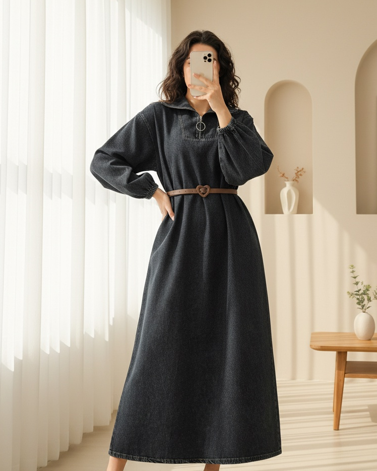 Yarım Boğazlı Fermuarlı Cepli Kot Elbise -Füme-Füme