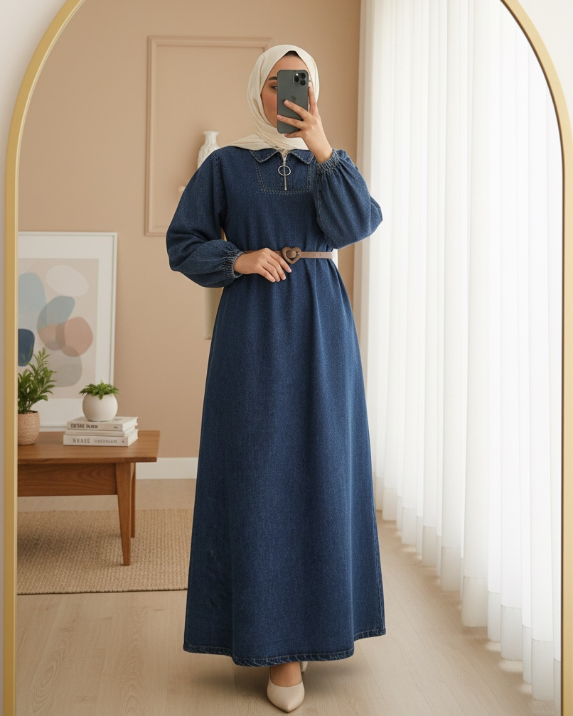 Yarım Boğazlı Fermuarlı Cepli Kot Elbise -İndigo-İndigo