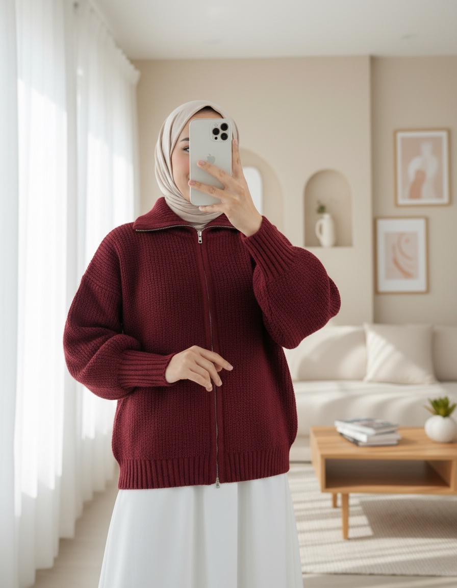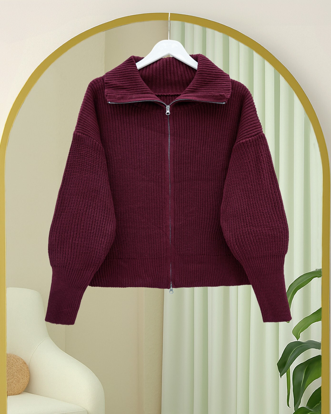 Yarım Boğazlı Fermuarlı Triko Hırka -Bordo-Bordo
