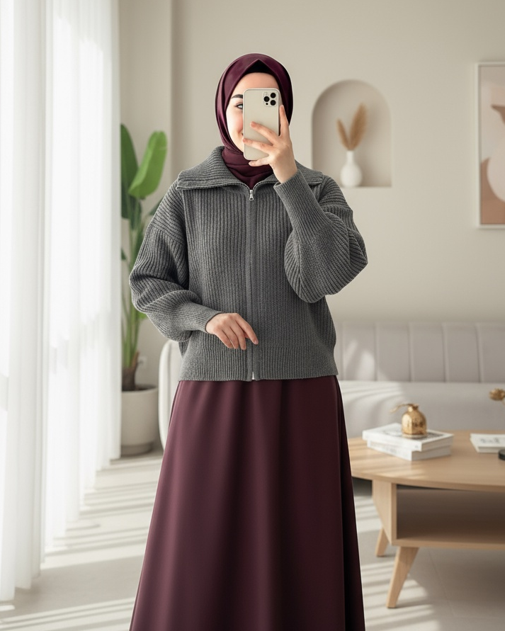 Yarım Boğazlı Fermuarlı Triko Hırka -Füme-Füme