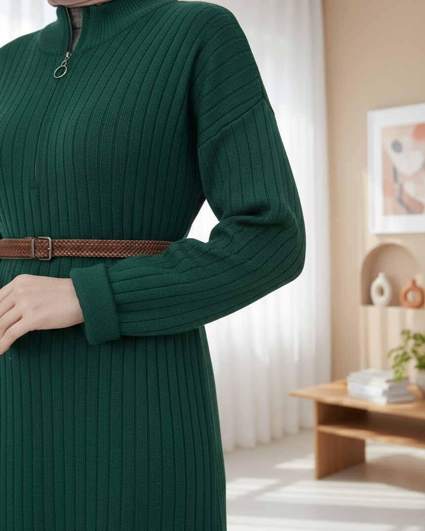 Yarım Bogazlı Fermuarlı Uzun Triko Elbise -Zümrüt-Zümrüt