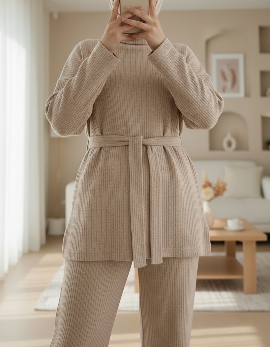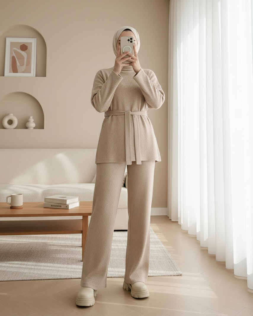 Yarım Boğazlı Kuşaklı Fitilli Takım -Bej-Bej