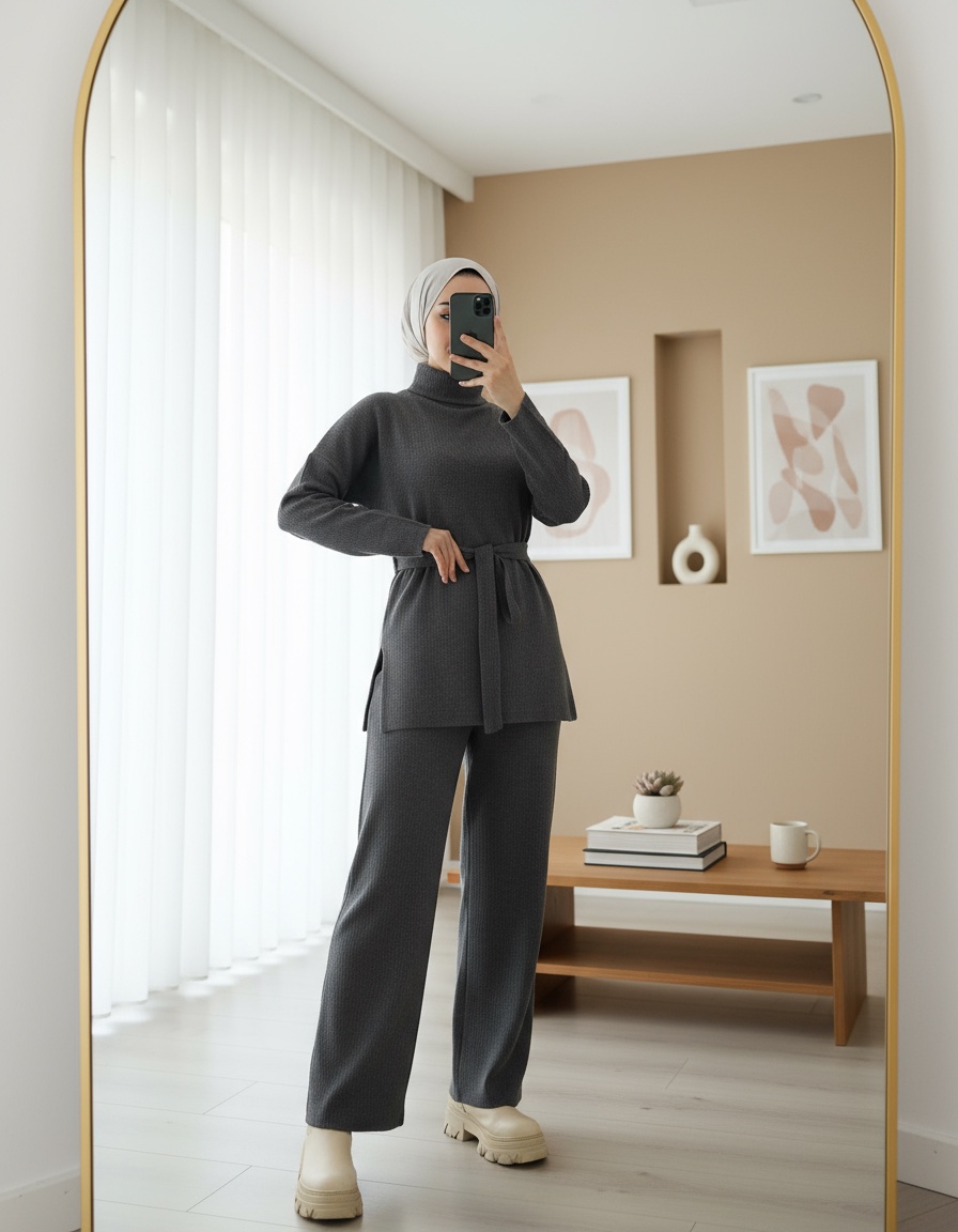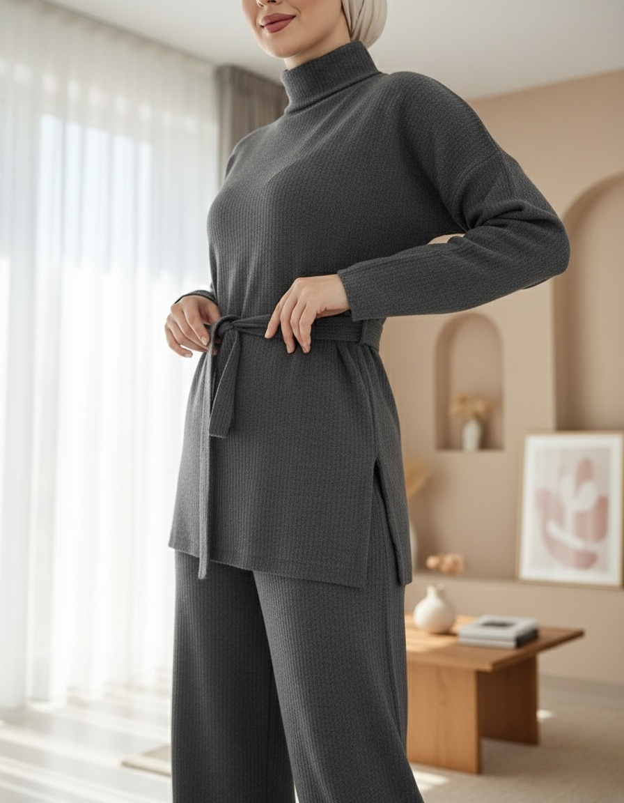 Yarım Boğazlı Kuşaklı Fitilli Takım -Füme-Füme