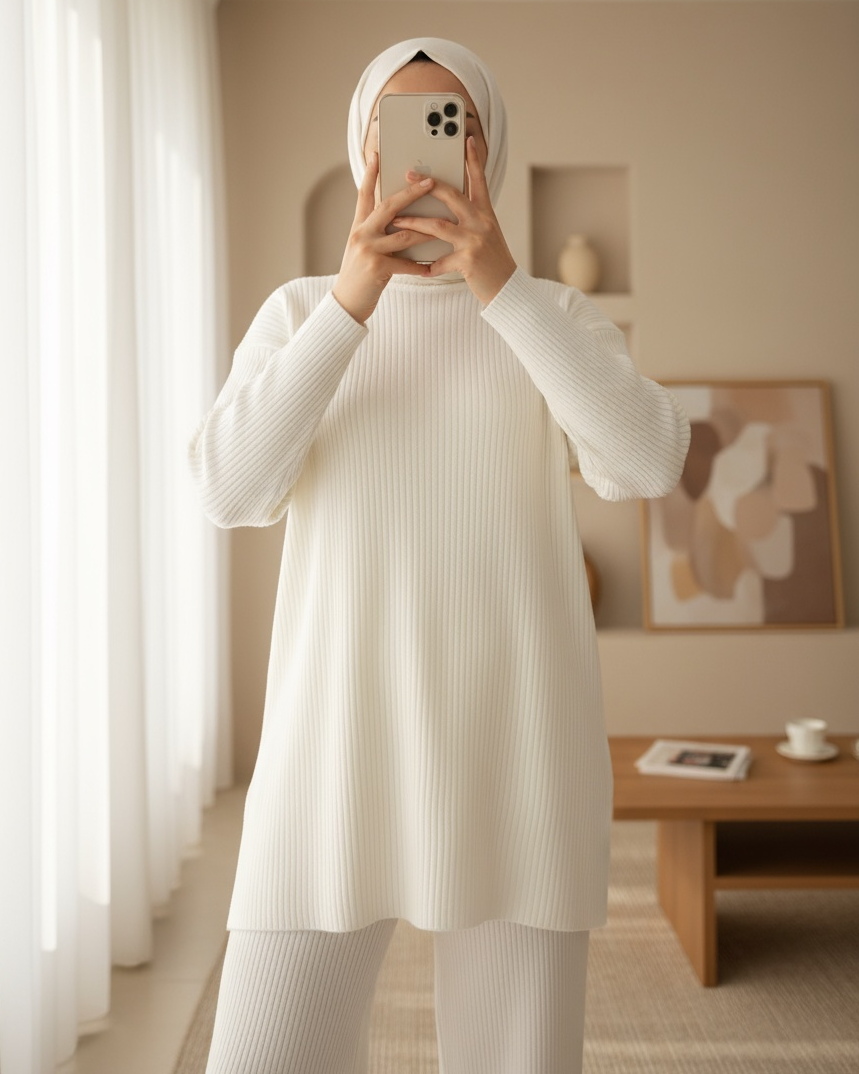 Yarım Boğazlı Triko Takım -Ekru-Ekru