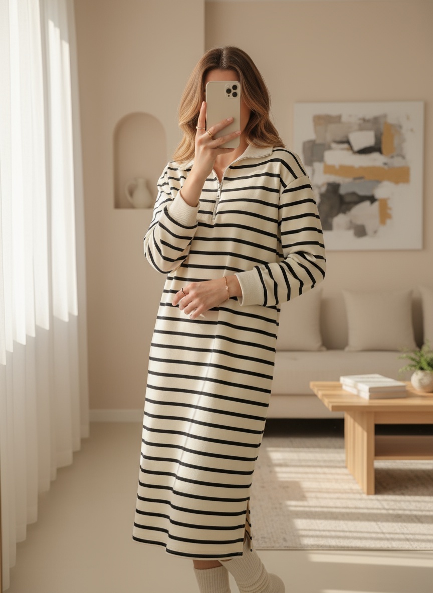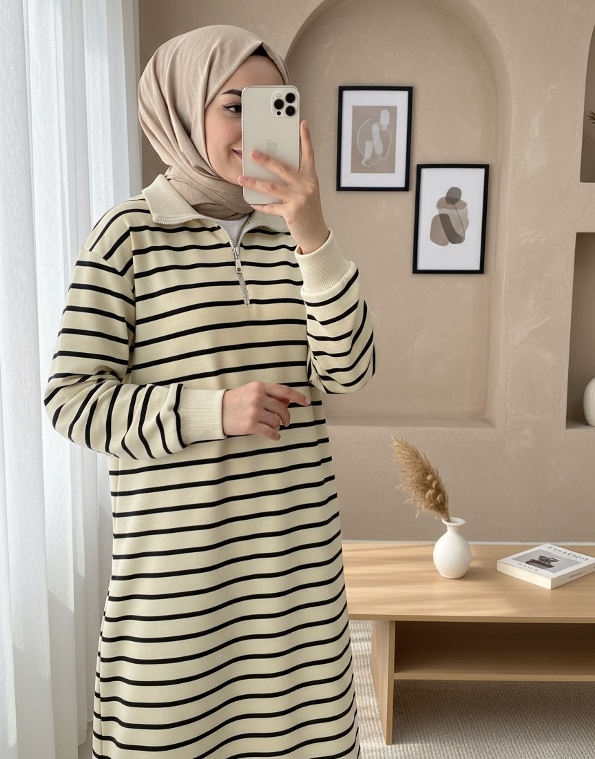 Yarım Boğazlı Yakası Fermuarlı Çizgili Tunik -Siyah-Siyah