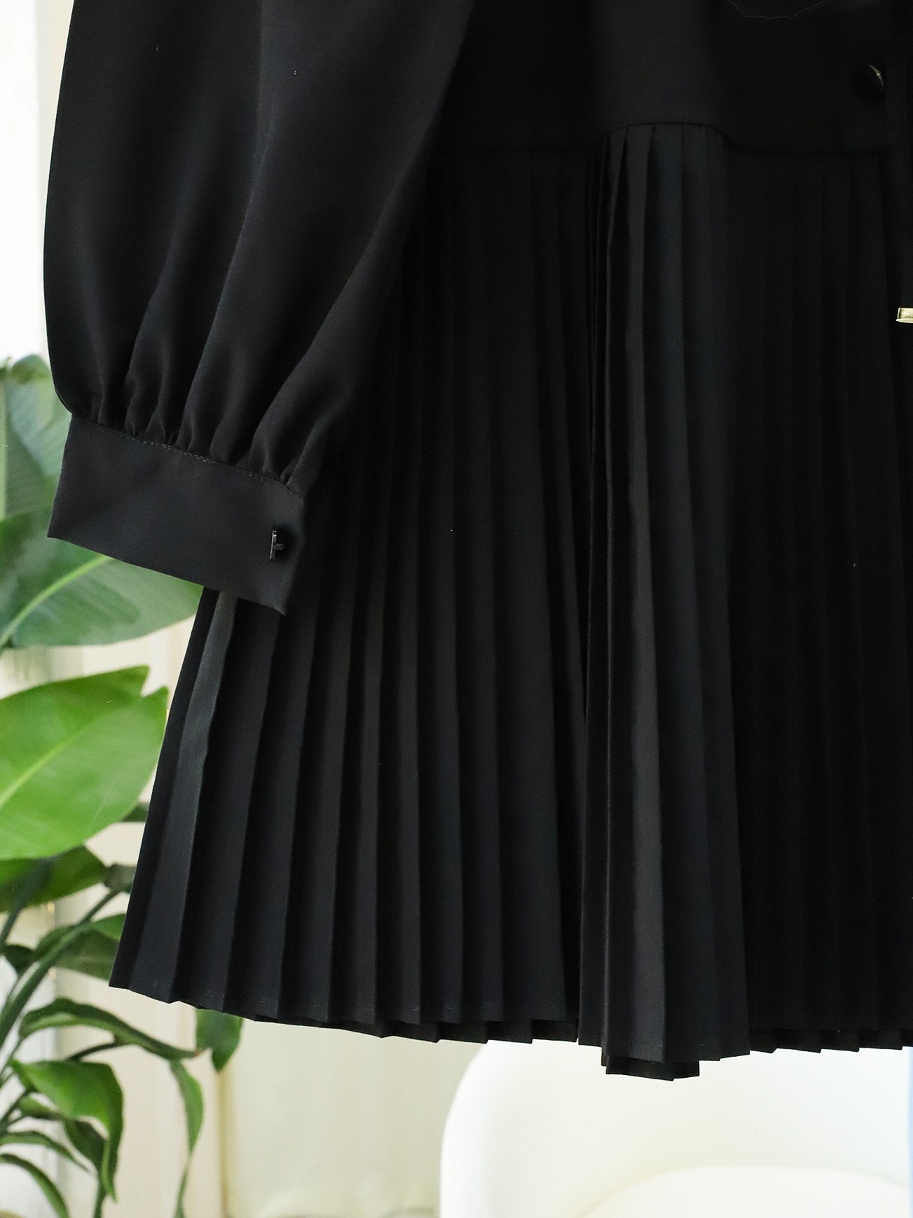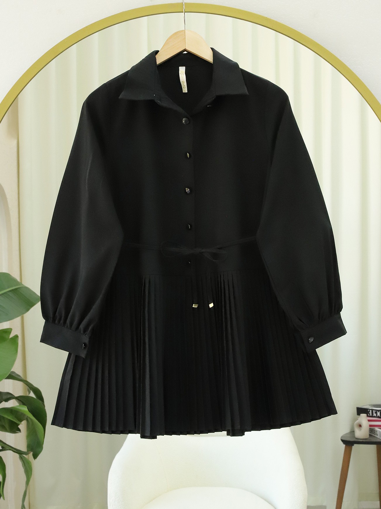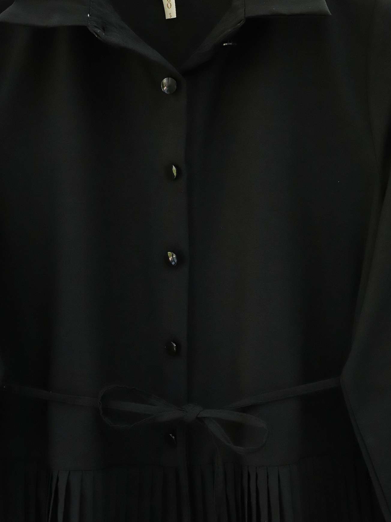Yarım Düğmeli Beli Bağlamalı Piliseli Gömlek -Siyah-siyah