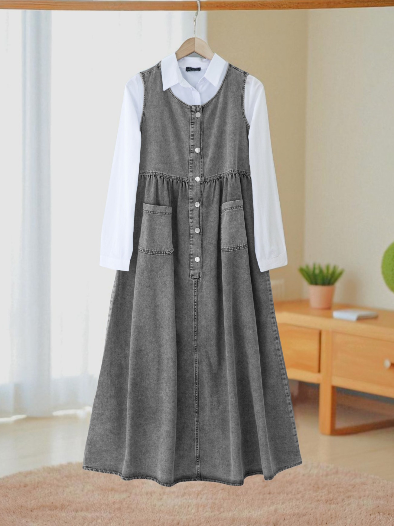 Yarım Düğmeli Çift Cepli Sıfır Kol Kot Jile -Füme-Füme