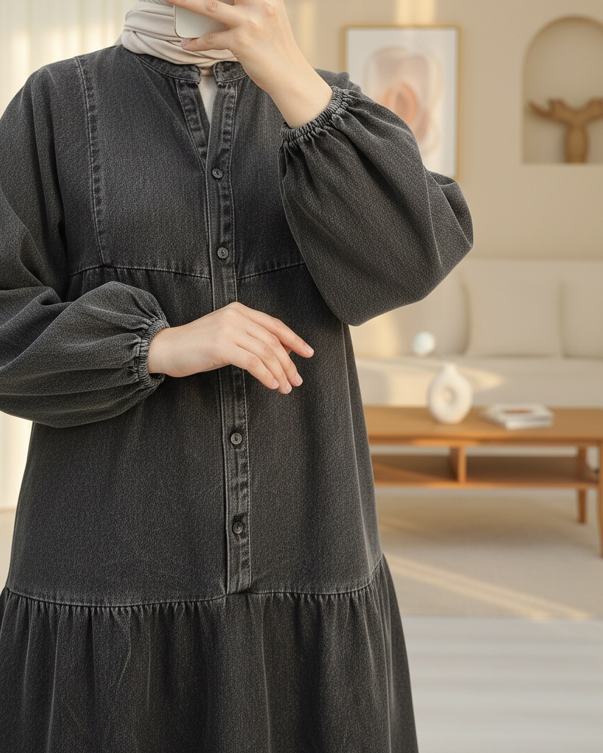 Yarım Düğmeli Kolu Lastikli Yarasa Kol Kot Elbise -Füme-Füme