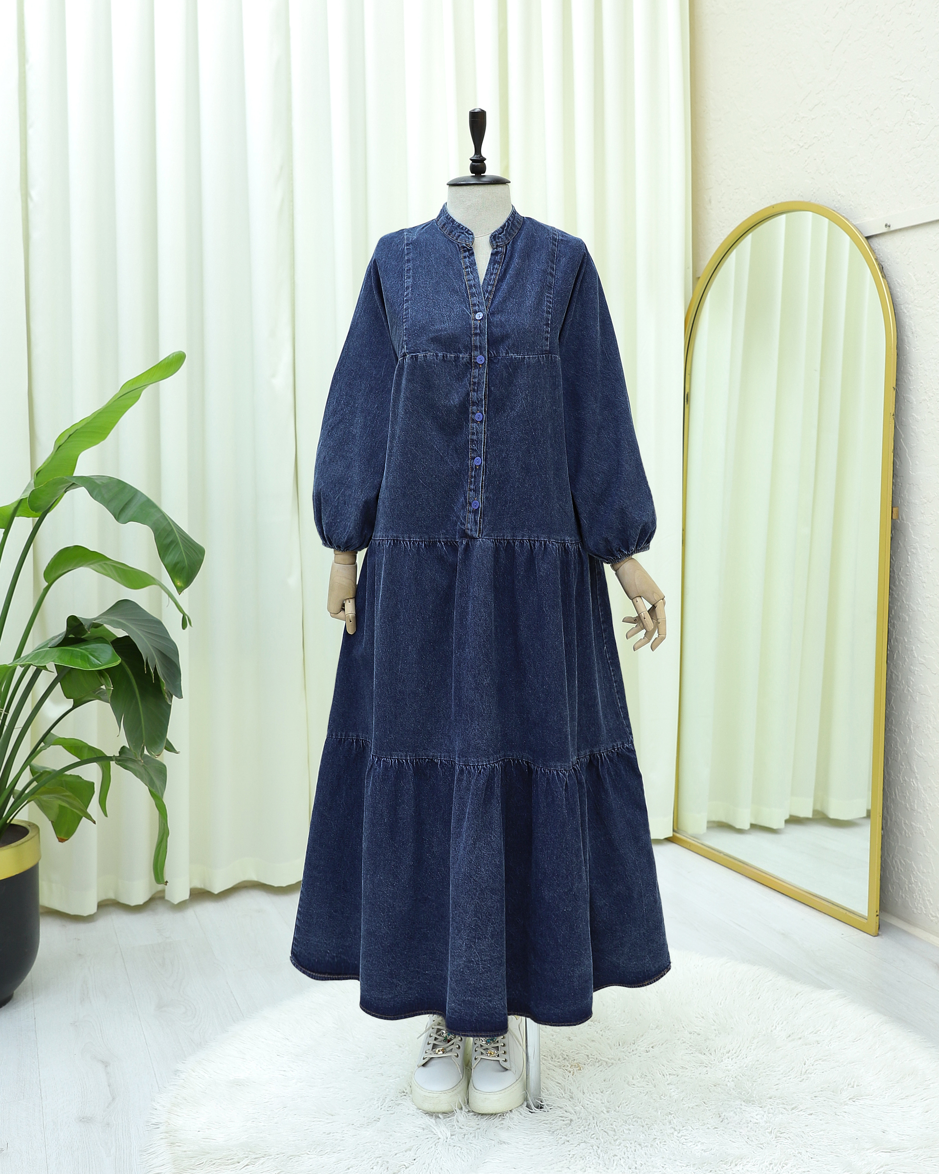 Yarım Düğmeli Kolu Lastikli Yarasa Kol Kot Elbise -İndigo-İndigo