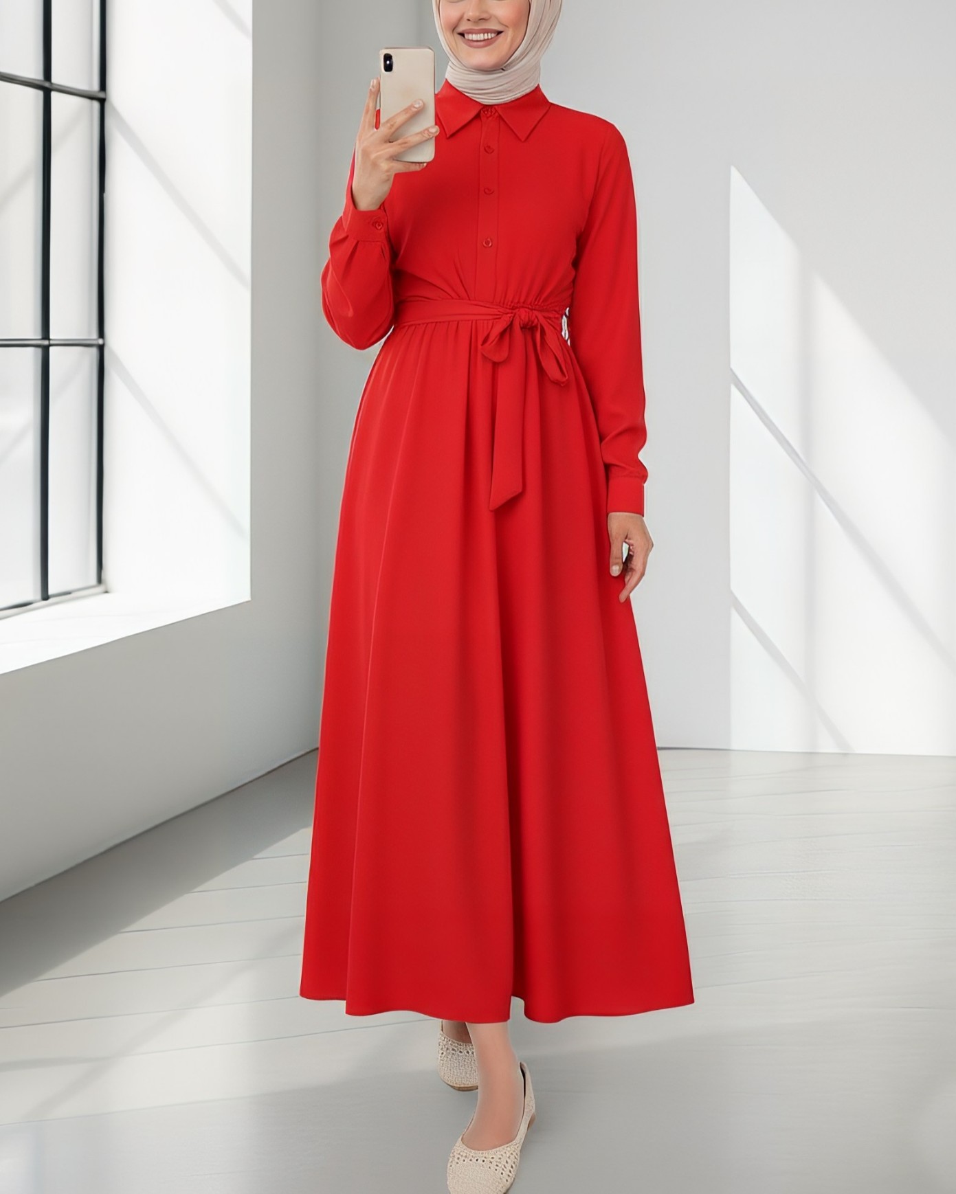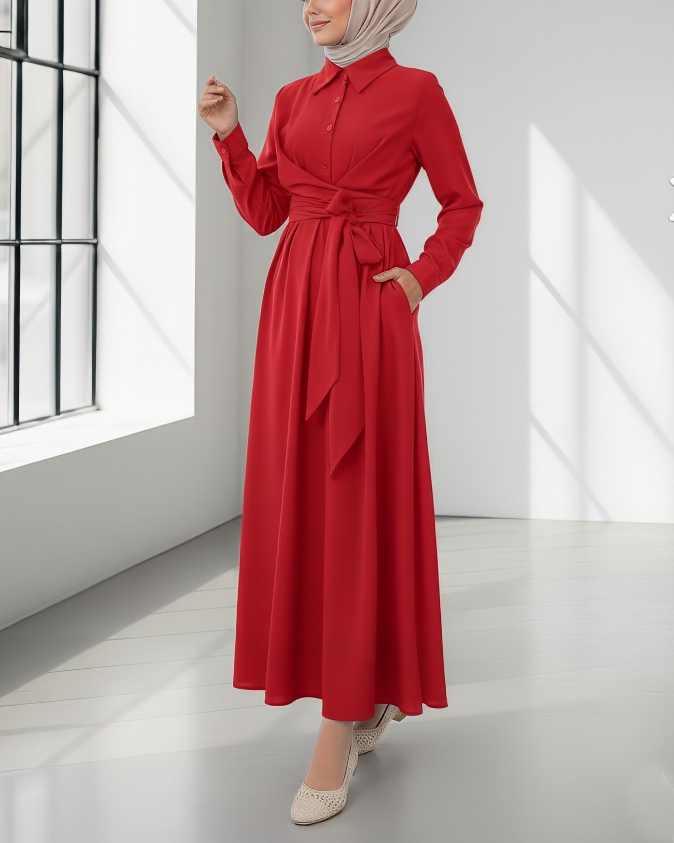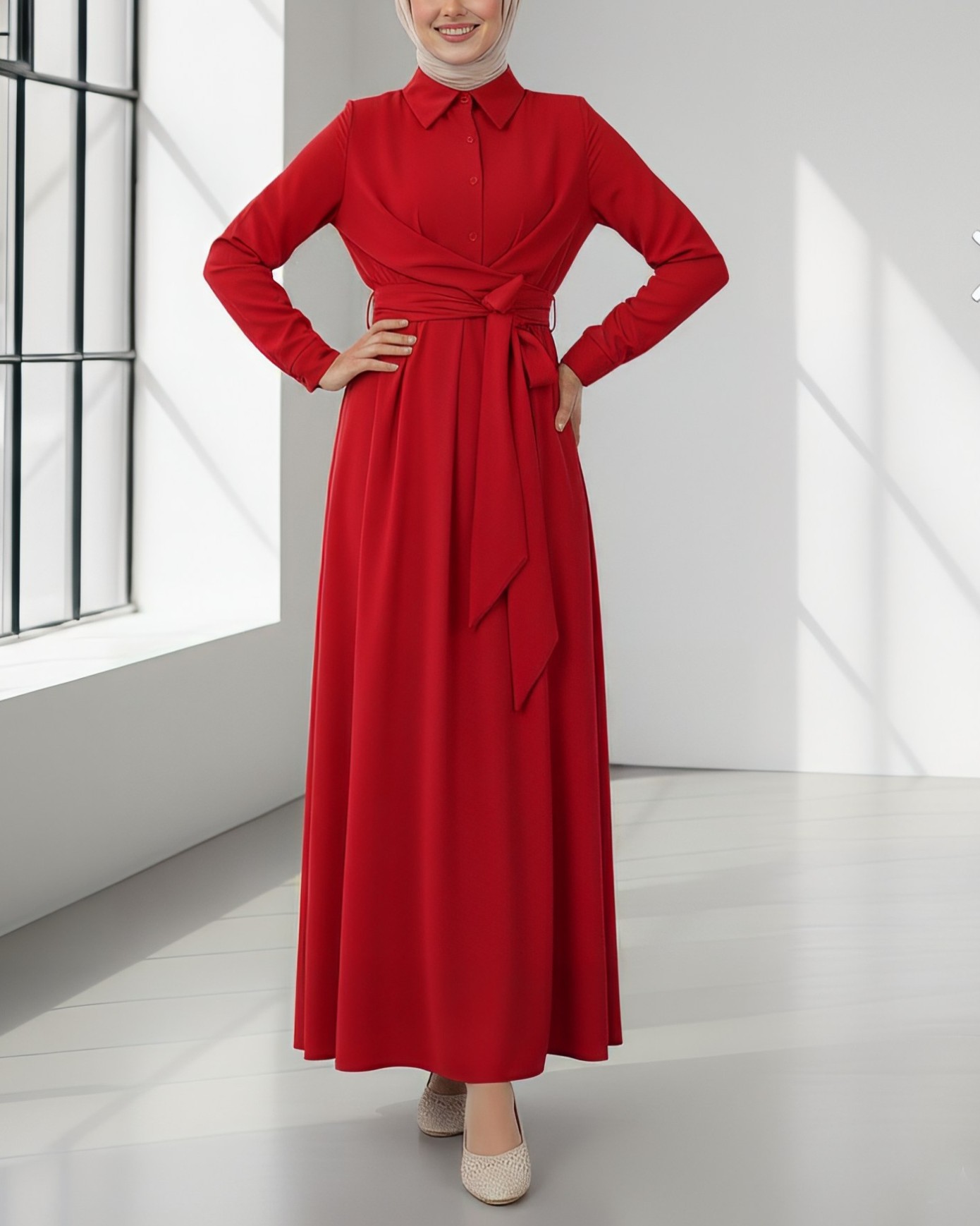 Yarım Düğmeli Önü Çapraz Bağlamalı Elbise -Kırmızı-Kırmızı