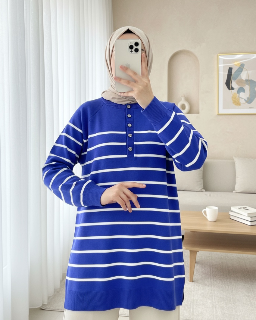 Yarım Düğmeli Yırtmaçlı Triko Tunik -Saks-Saks