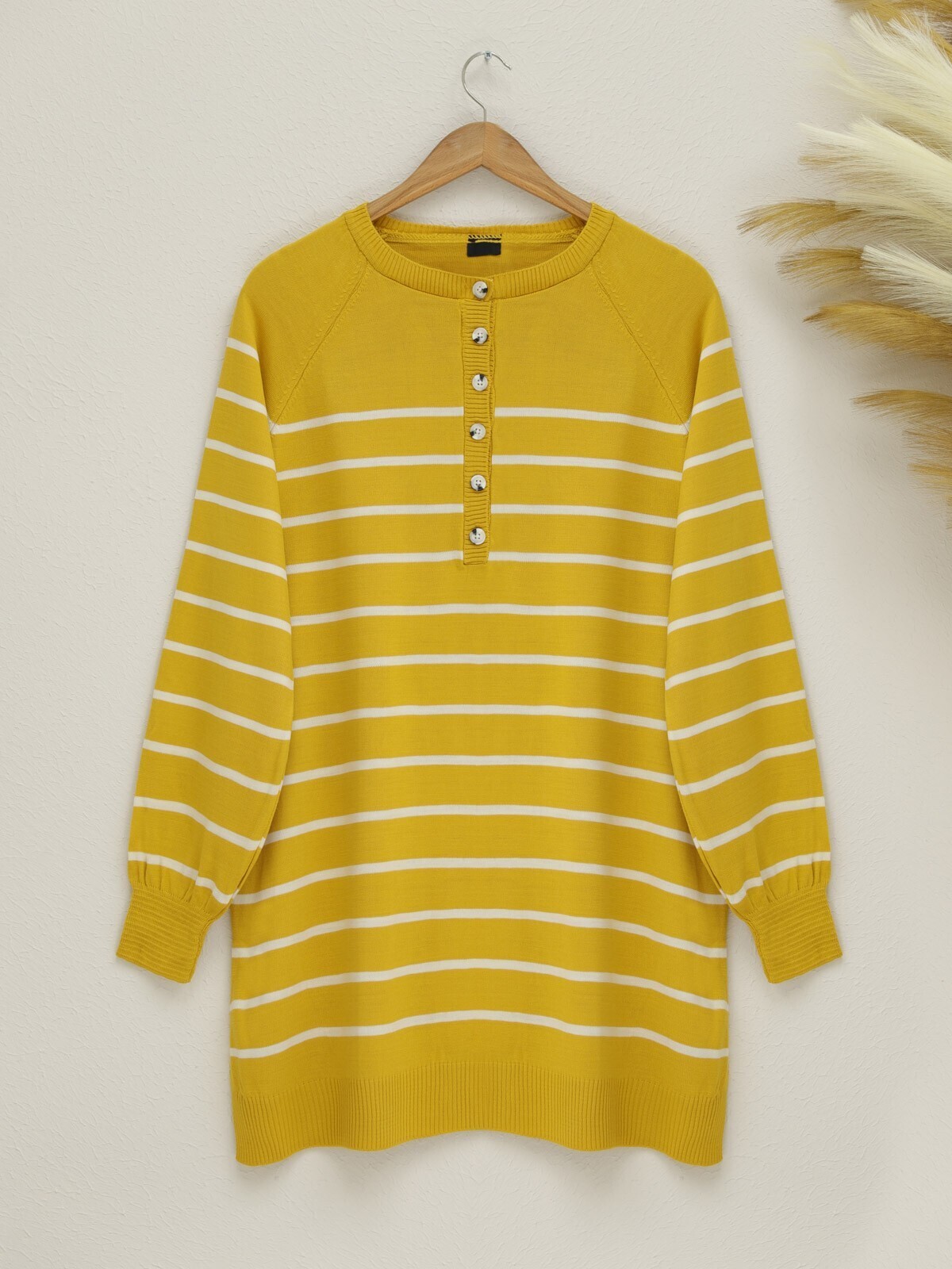 Yarım Düğmeli Yırtmaçlı Triko Tunik -Sarı-Sarı