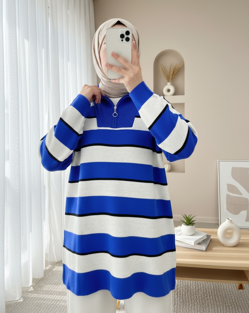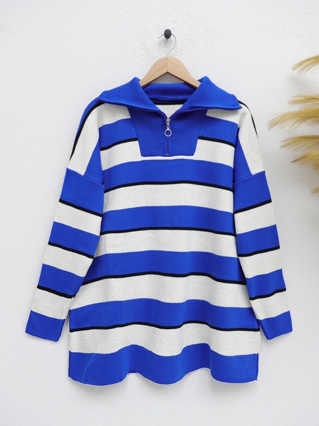 Yarım Fermuarlı Boğazlı Triko Tunik -Saks-Saks