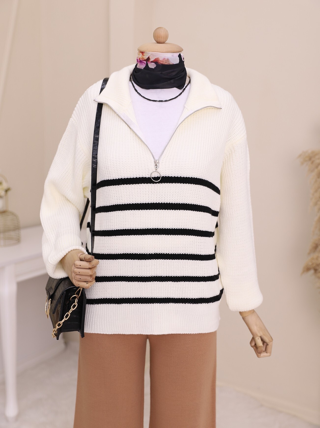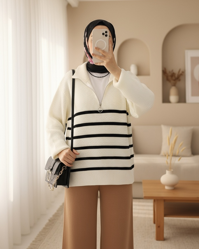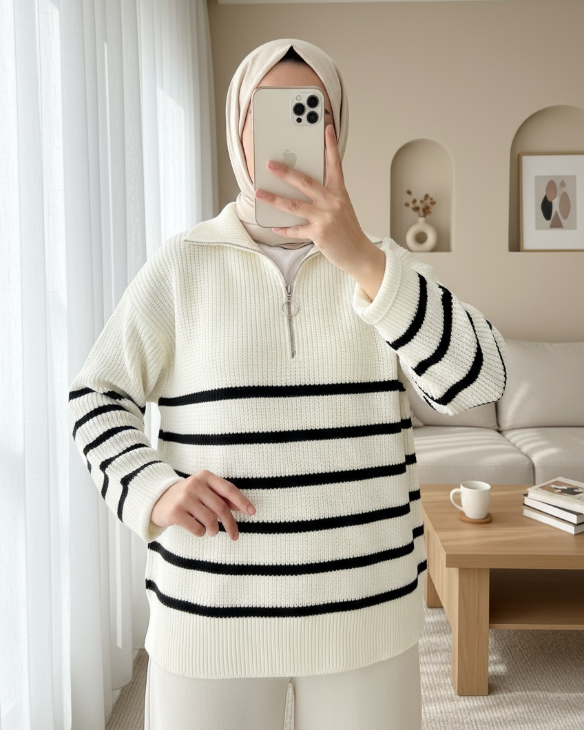 Yarım Fermuarlı Yan Çizgili Triko Kazak -Ekru-Ekru
