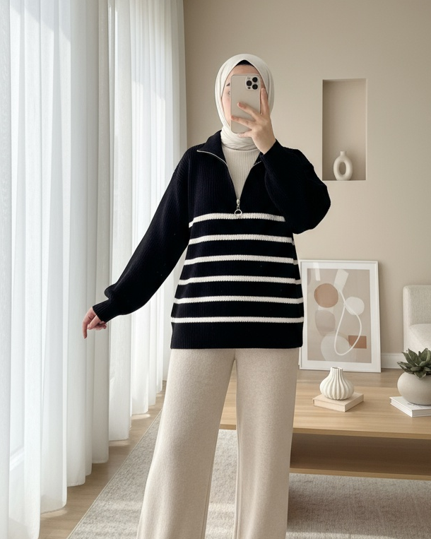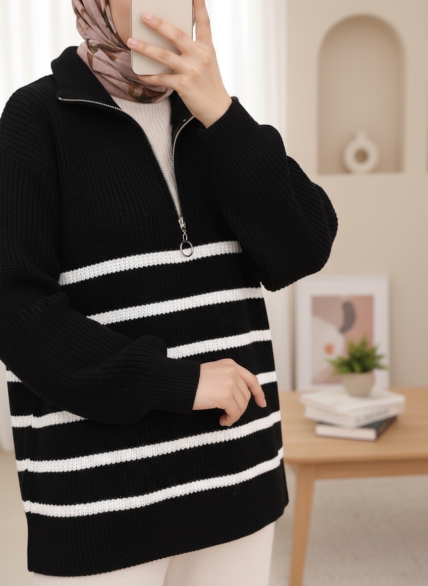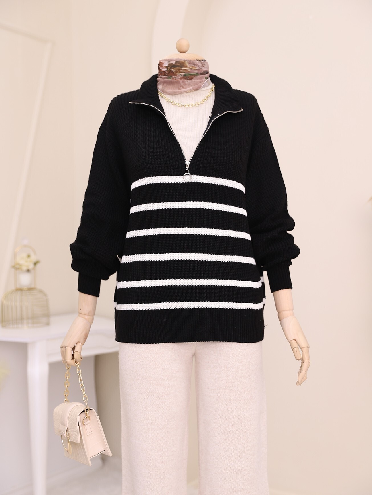 Yarım Fermuarlı Yan Çizgili Triko Kazak -Siyah-Siyah
