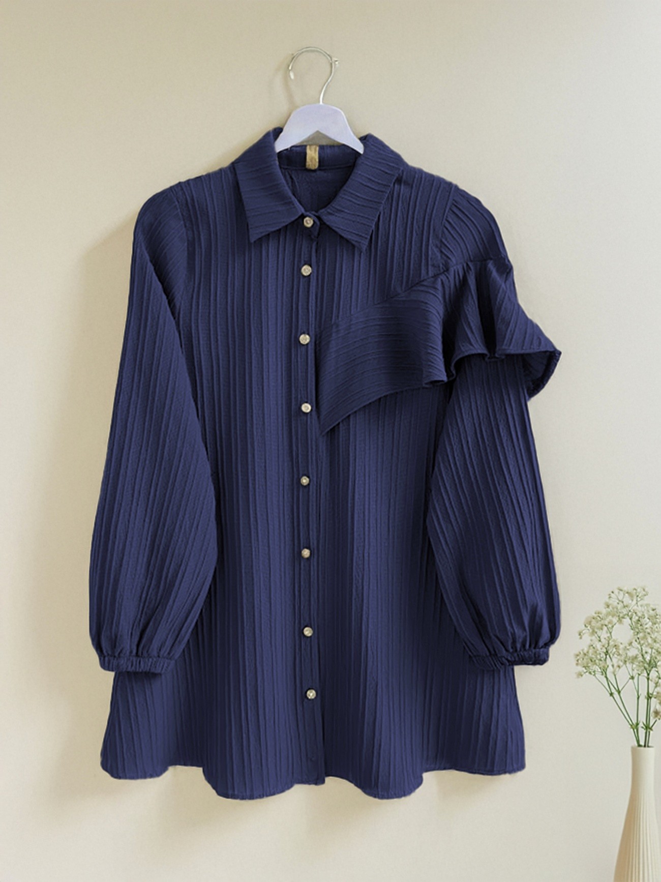 Yarım Fırfır Detaylı Kolu Lastikli Gömlek -Laci-Lacivert