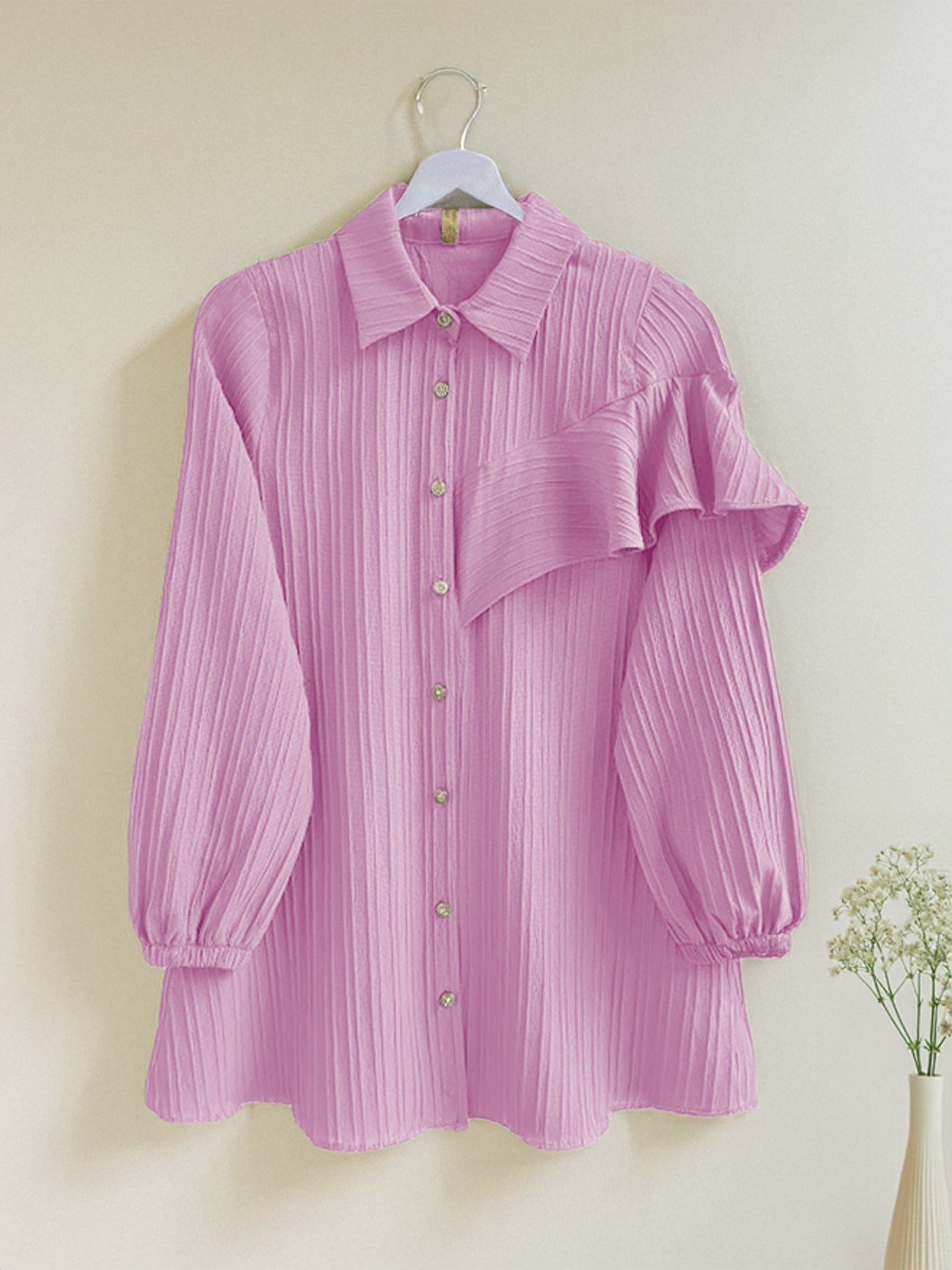 Yarım Fırfır Detaylı Kolu Lastikli Gömlek -Pembe-Pembe