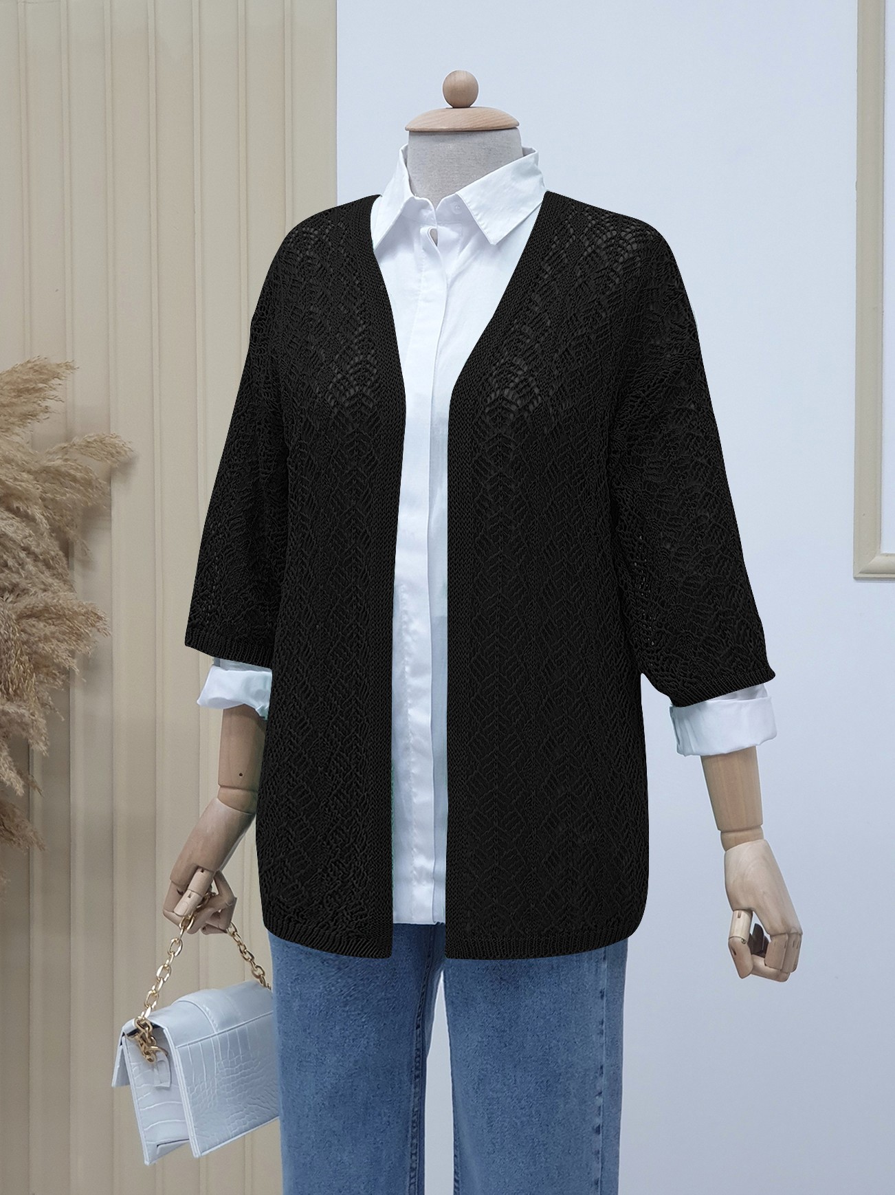 Yarım Kol Ajurlu Kısa Hırka -Siyah-siyah