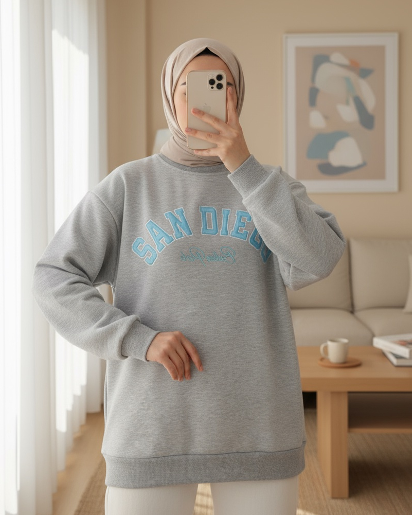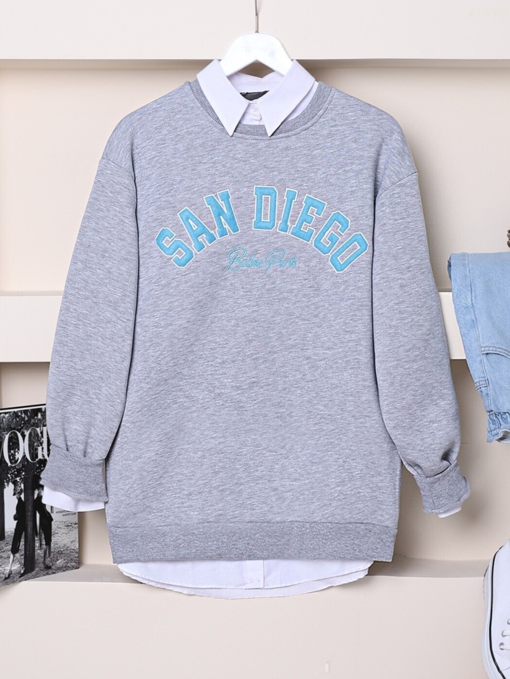 Yazı Nakışlı 3 İplik Sweat -Gri-Gri