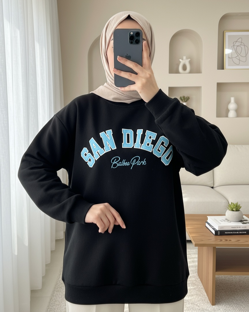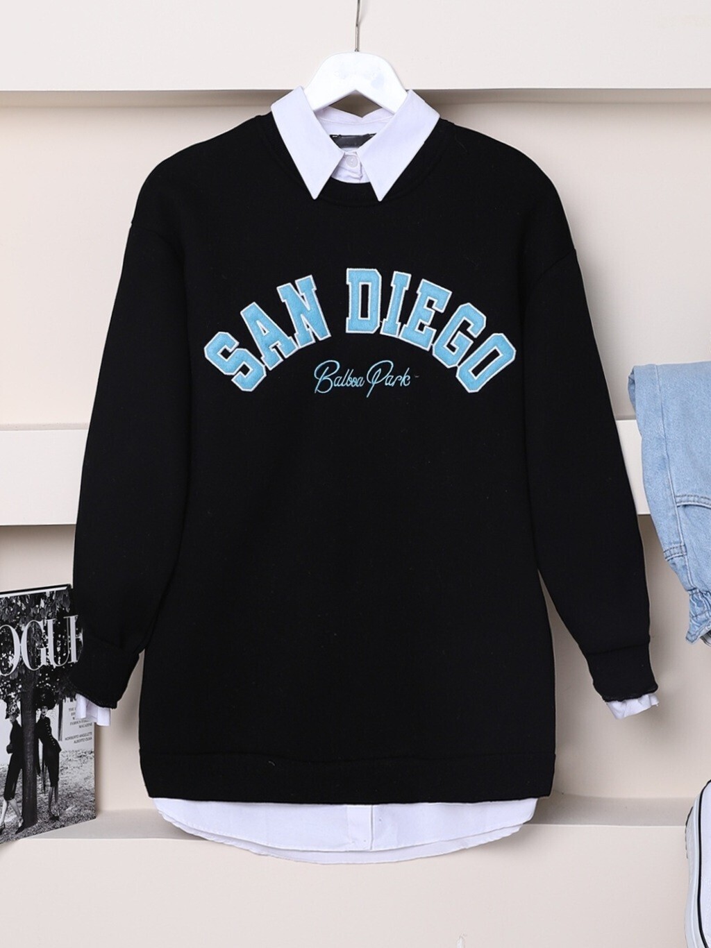 Yazı Nakışlı 3 İplik Sweat -Siyah-Siyah