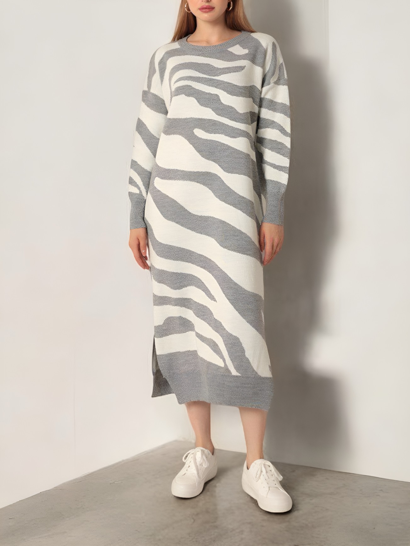 Yırtmaçlı Desenli Triko Elbise -Gri-Gri