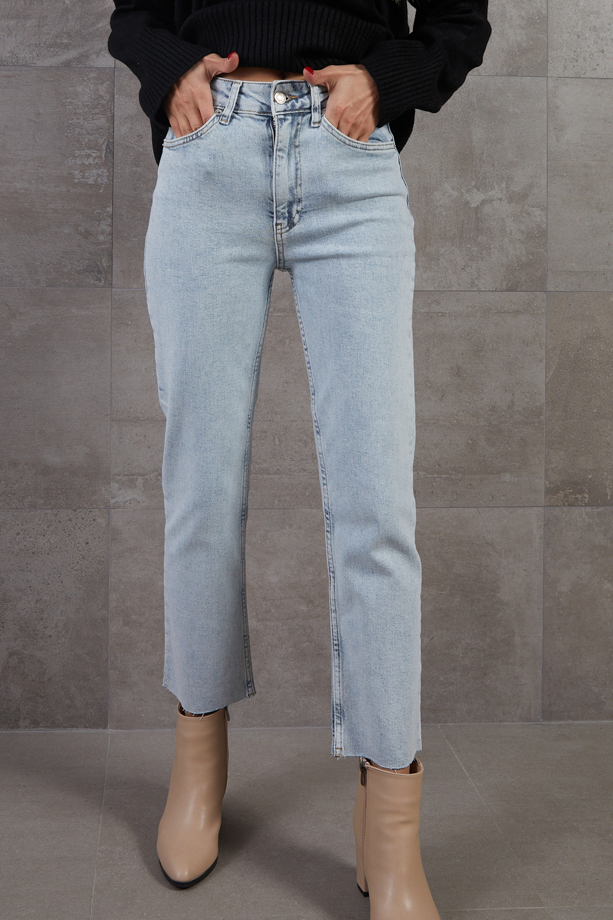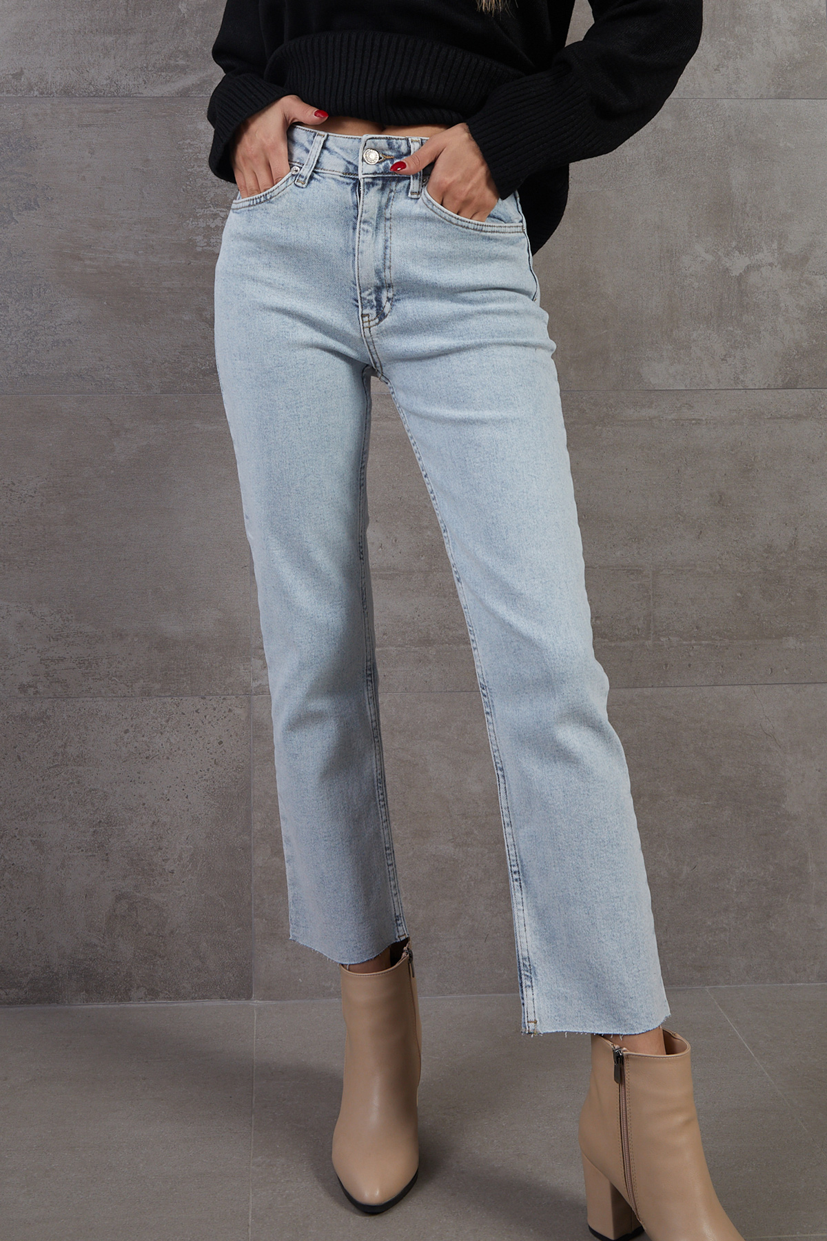 Yüksek Bel Kesik Paça Kot Pantolon-Buz Mavi