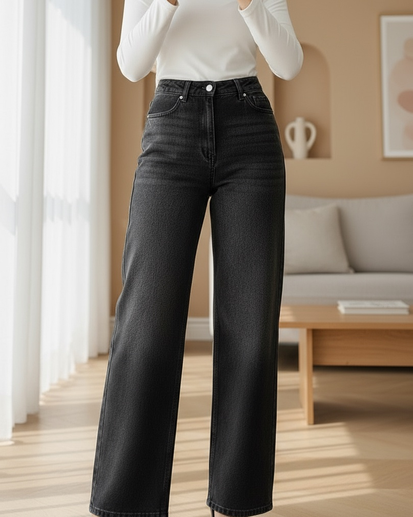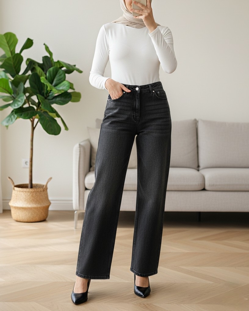 Yüksek Bel Likralı Cepli Bol Paça Eskitme Kot Pantolon -Siyah-siyah