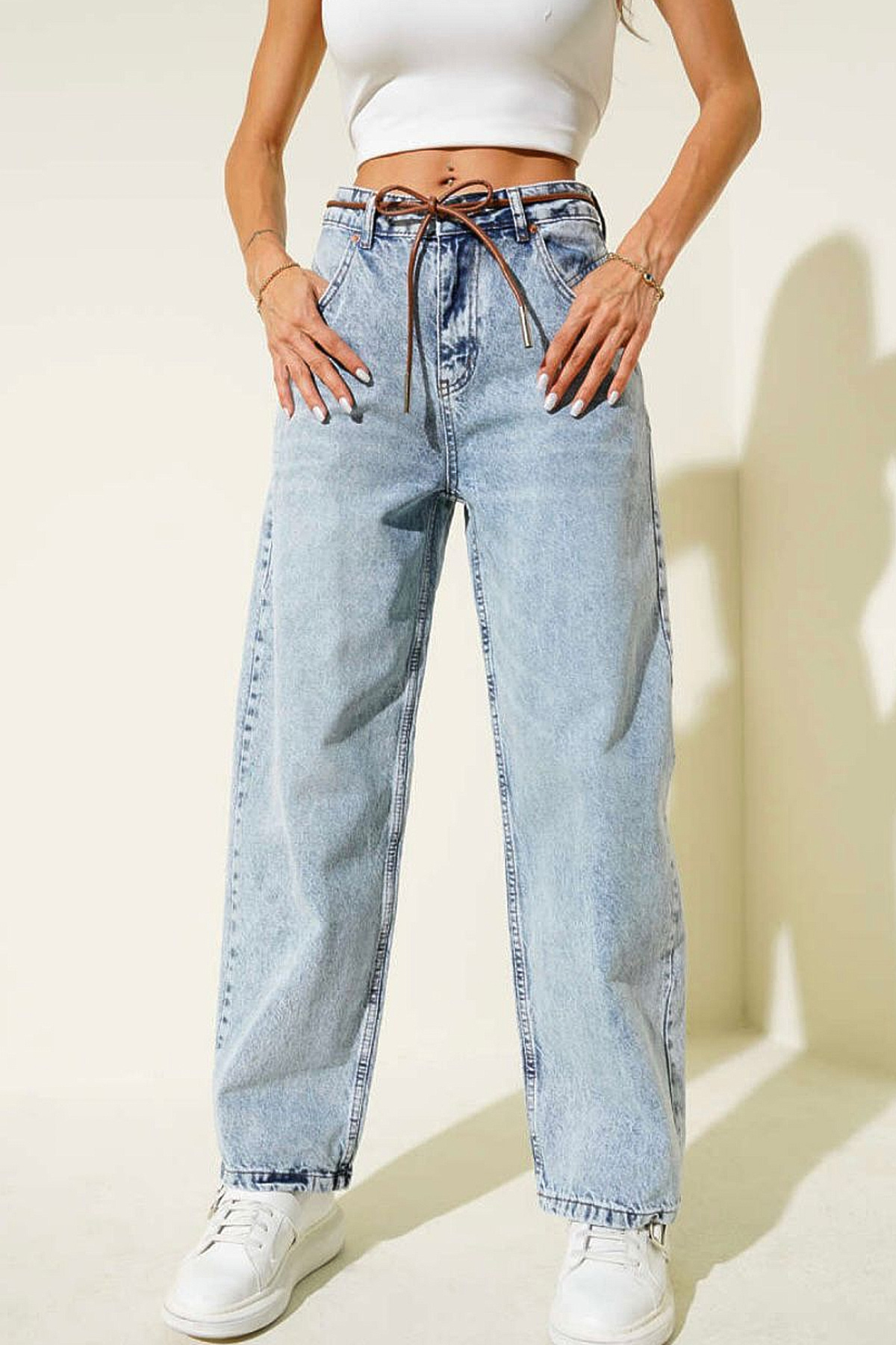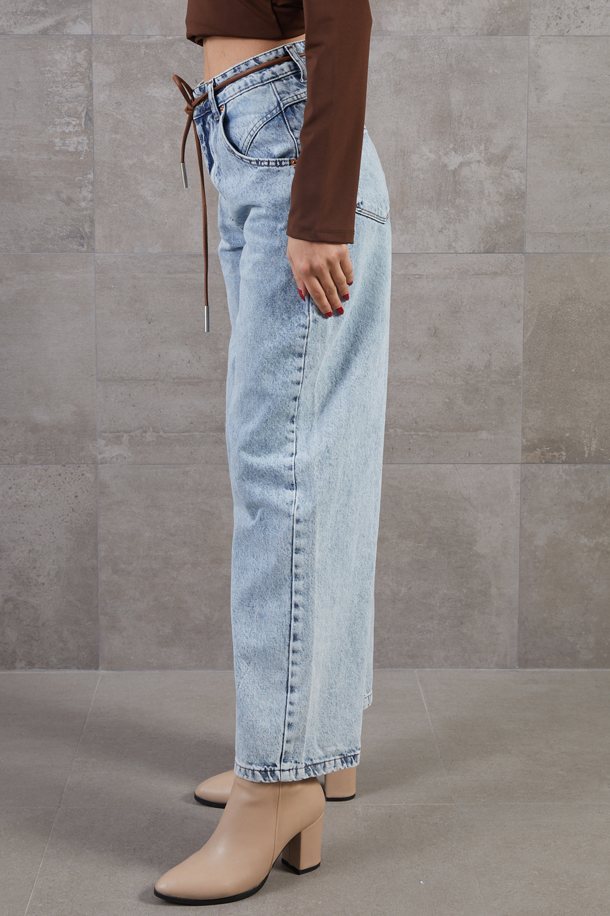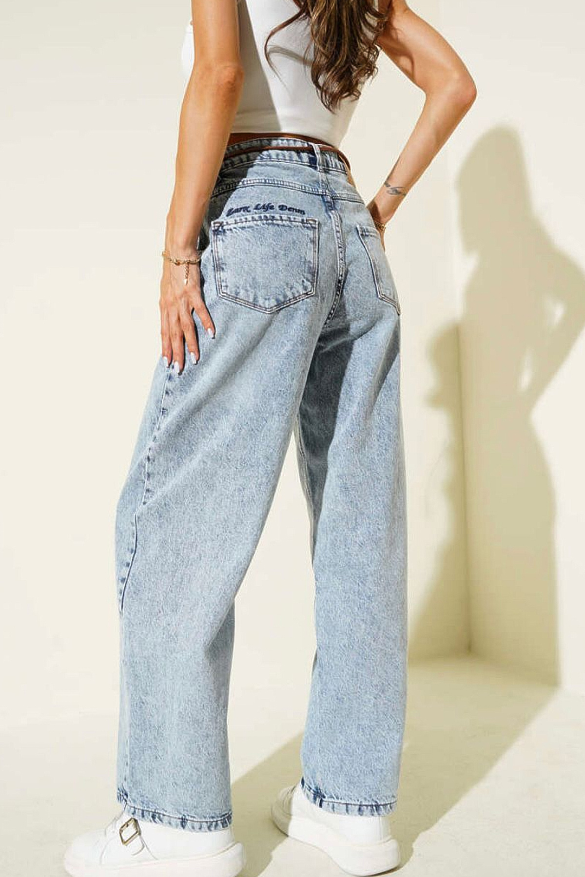 Yüksek Bel Salaş Paça Denim Kot Pantolon-Açık Mavi