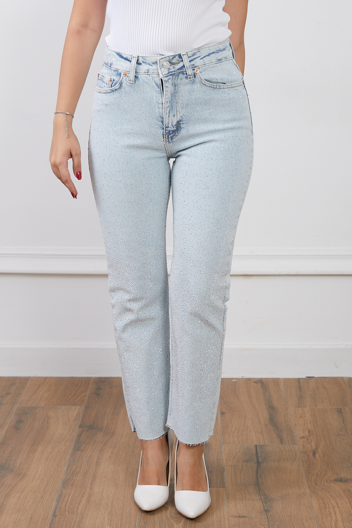 Yüksek Bel Taşlı Kesik Paça Kot Pantolon-Açık Mavi
