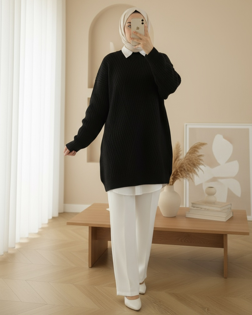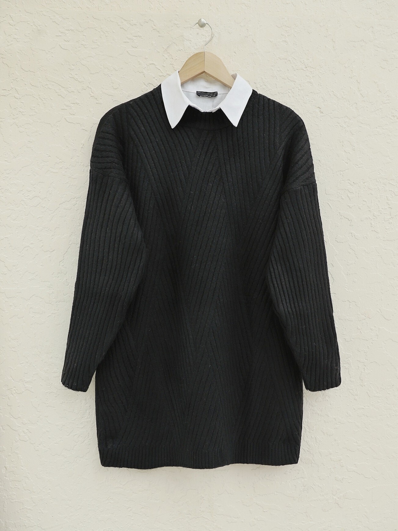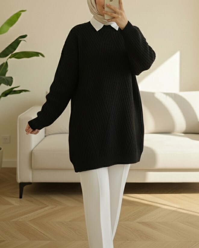 Yürütme Örgü Baklava Desenli Triko Tunik -Siyah-Siyah