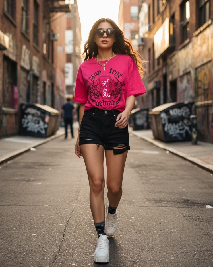 Yuvarlak Yaka Baskılı Crop Tişort -Pembe-Pembe