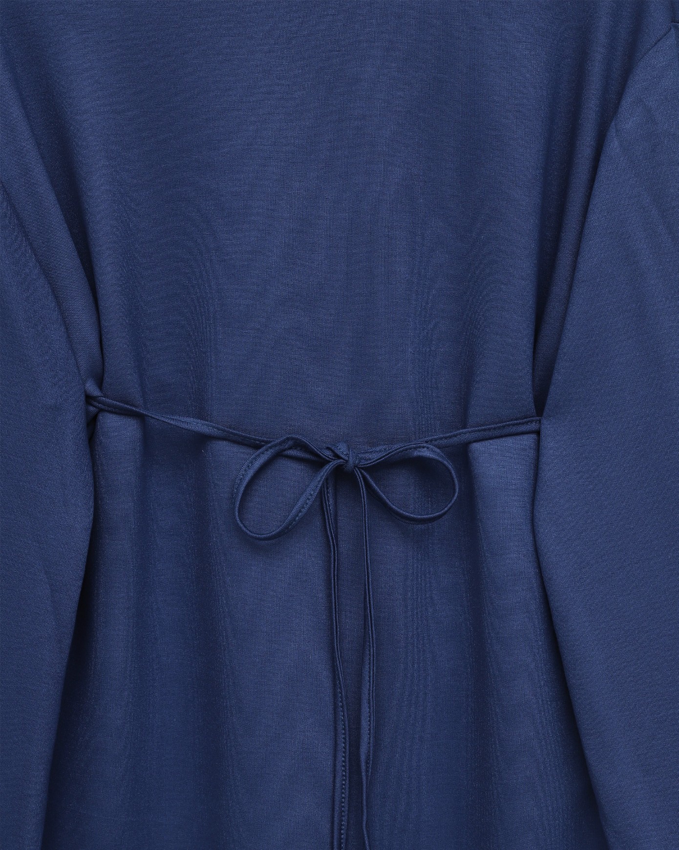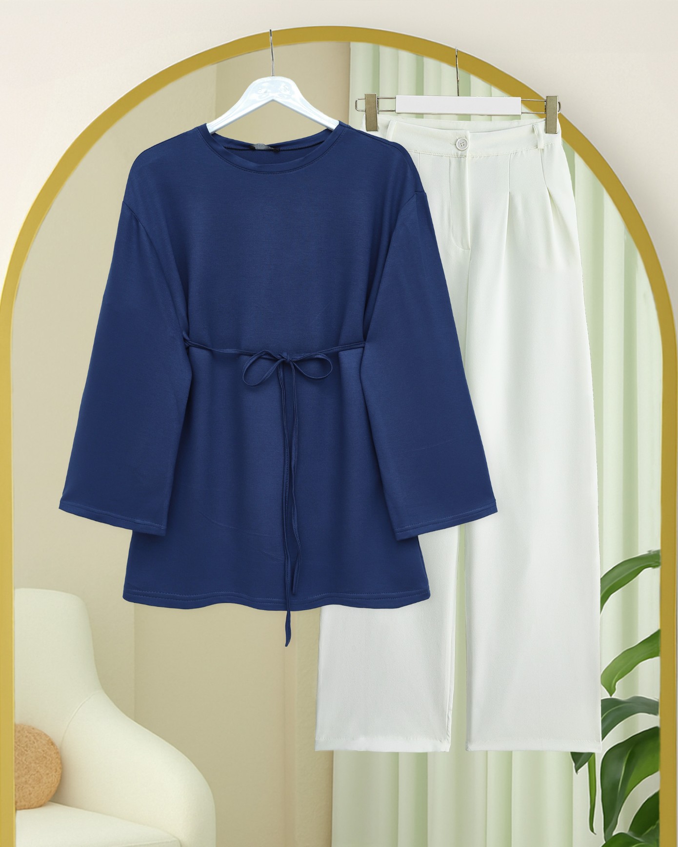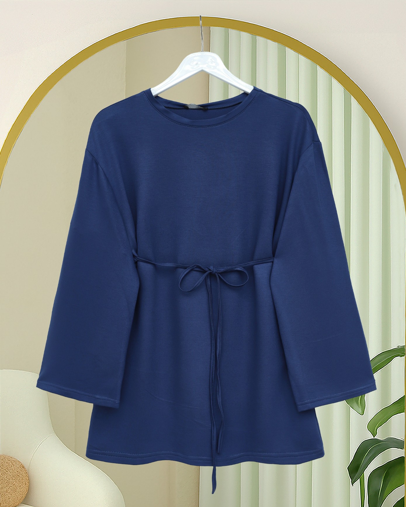 Yuvarlak Yaka Beli Bağlamalı Penye Tunik -Laci-Lacivert
