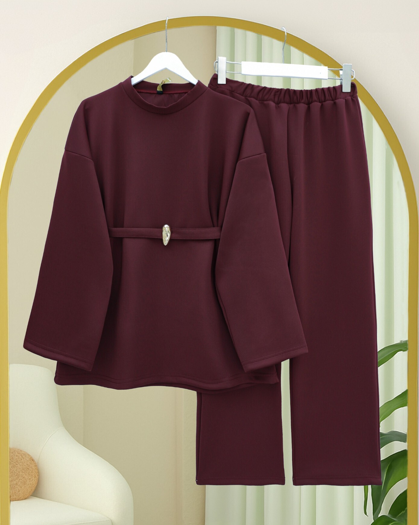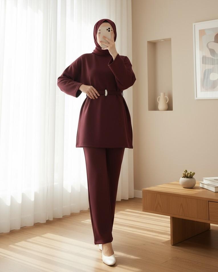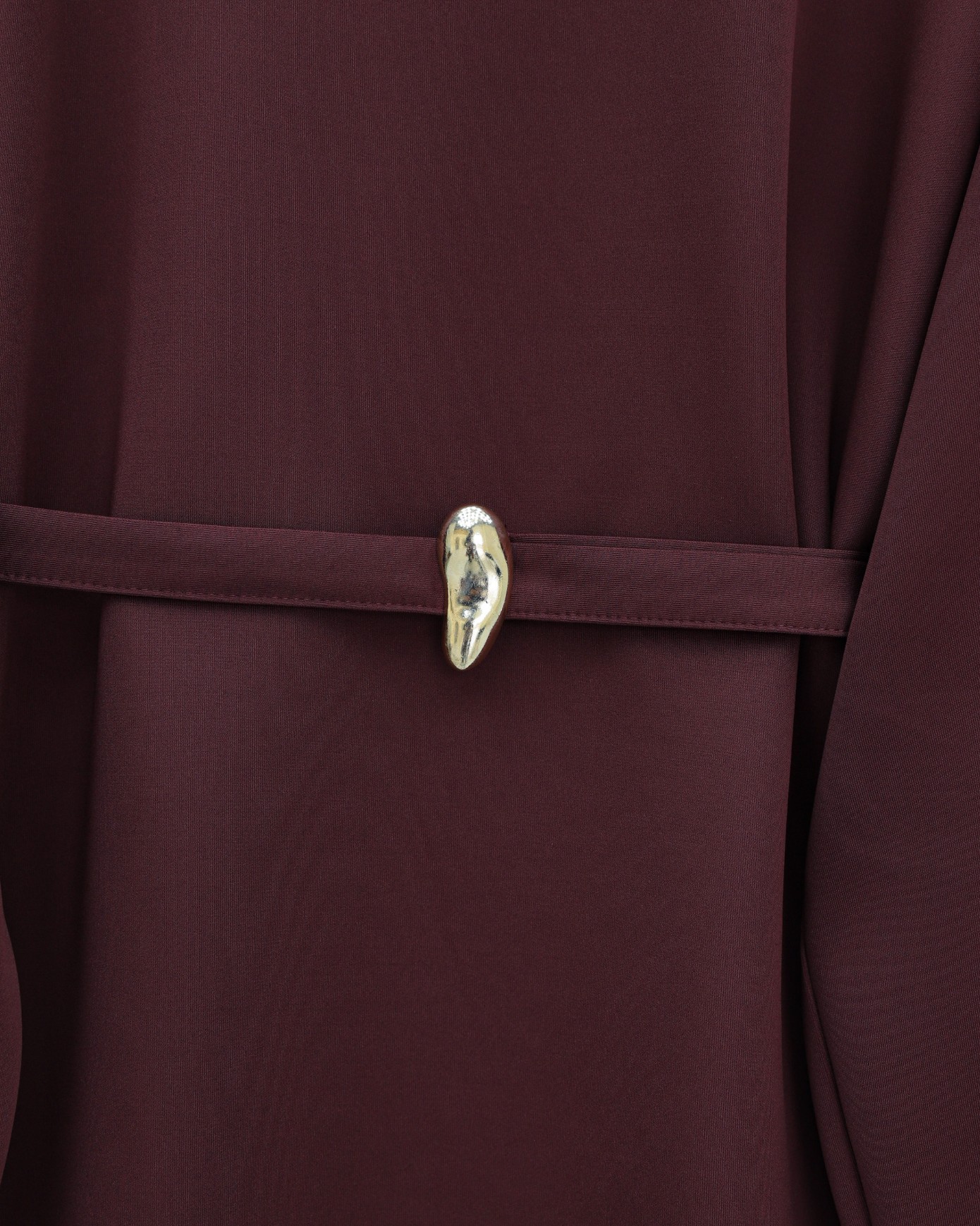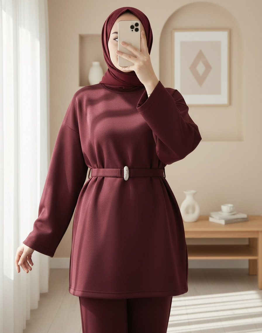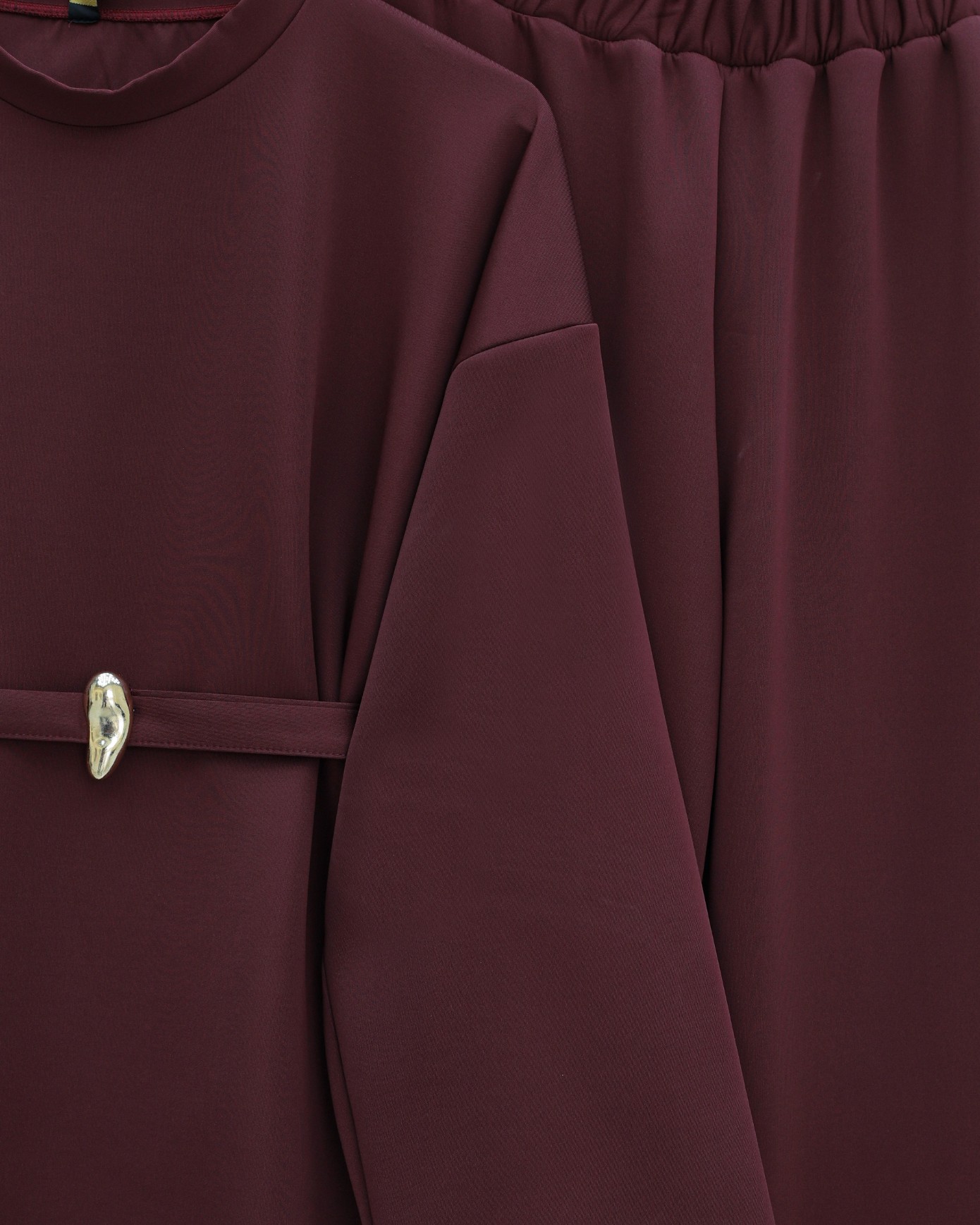 Yuvarlak Yaka Beli Kemerli Scuba Takım -Bordo-Bordo