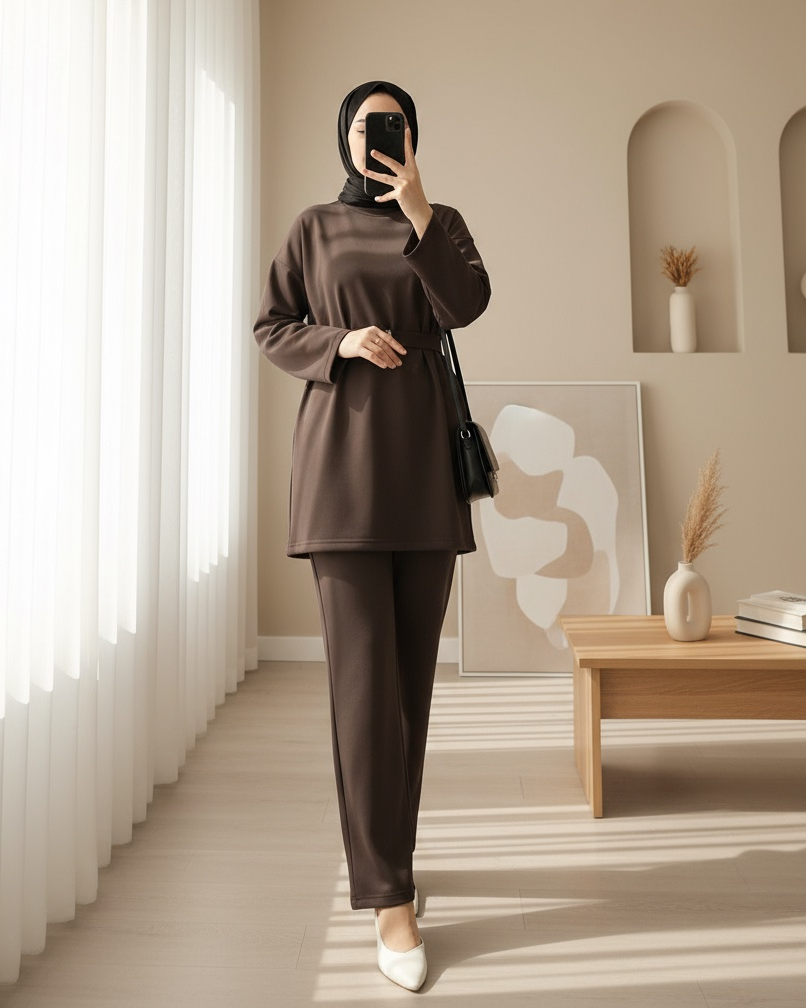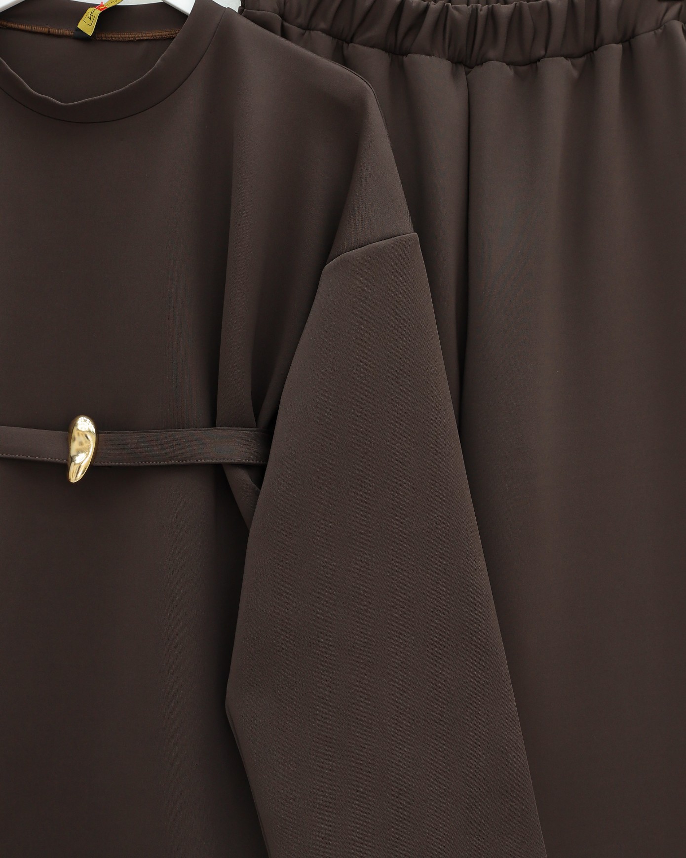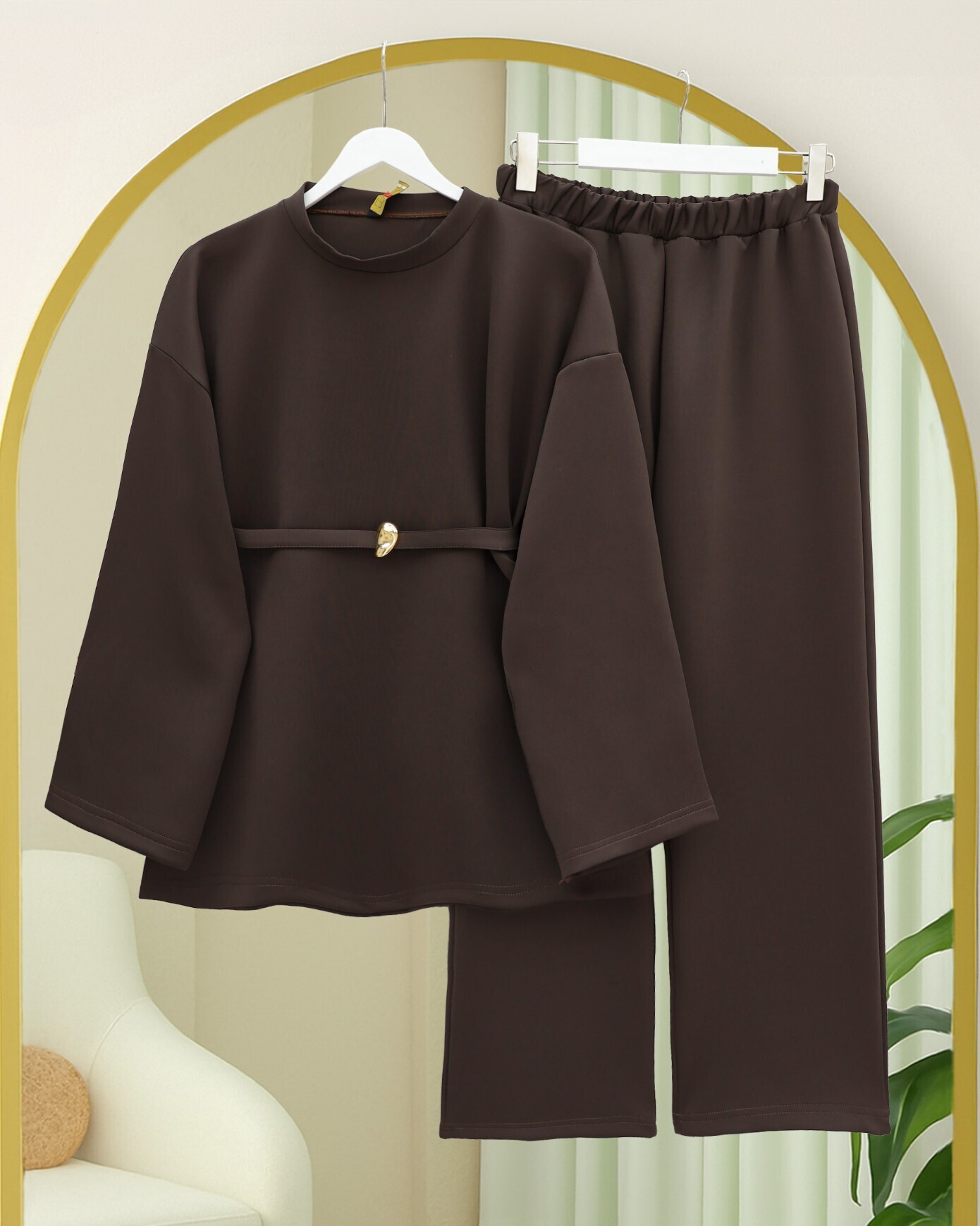 Yuvarlak Yaka Beli Kemerli Scuba Takım -K. Kahve-K. Kahve