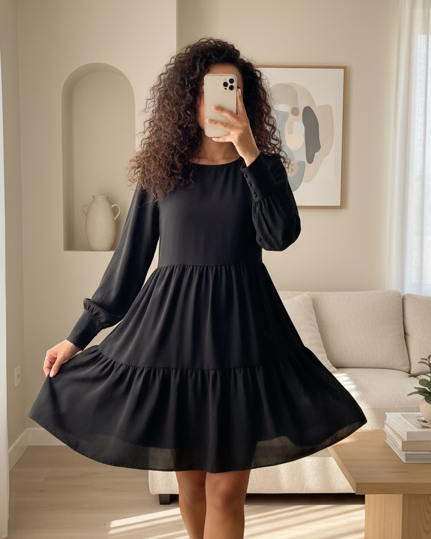 Yuvarlak Yaka Beli Lastikli Eteği Katlı Ayrobin Elbise -Siyah-Siyah