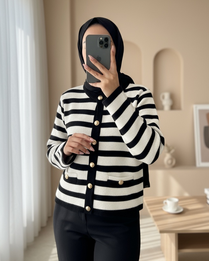 Yuvarlak Yaka Çizgili Cep Detaylı Hırka -Siyah-Siyah
