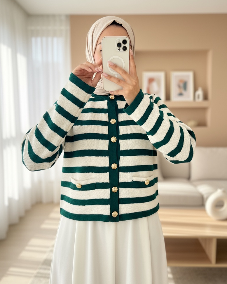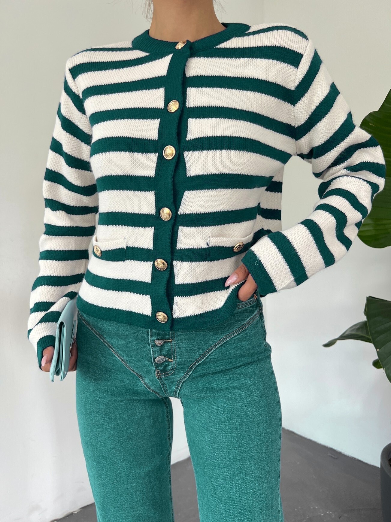 Yuvarlak Yaka Çizgili Cep Detaylı Hırka -Zümrüt-Zümrüt