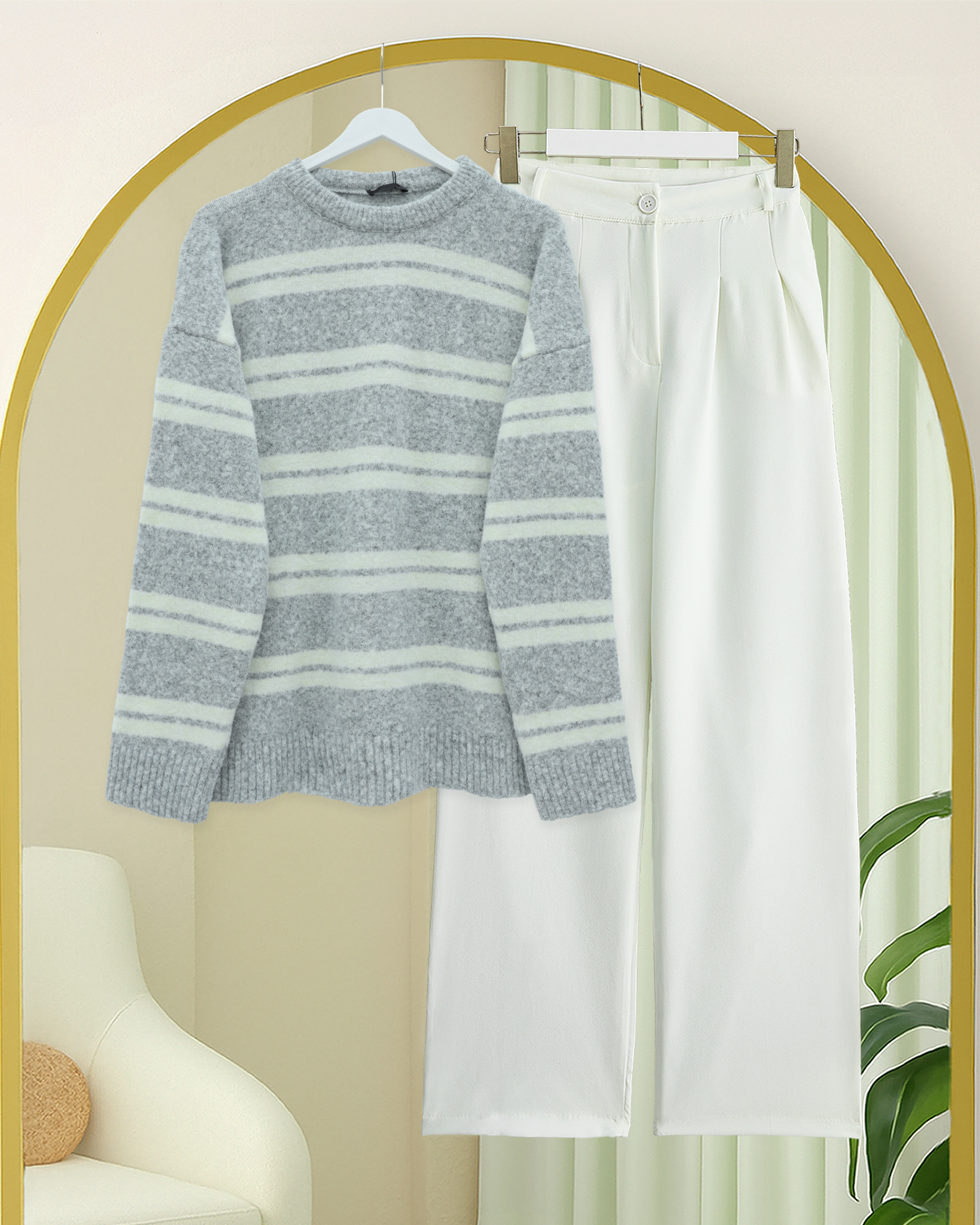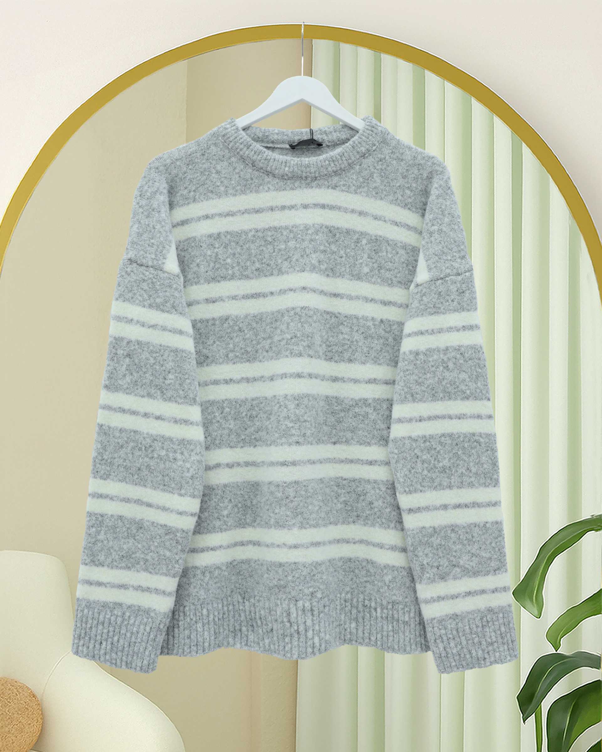 Yuvarlak Yaka Çizgili Yumoş Triko Kazak -Gri-Gri